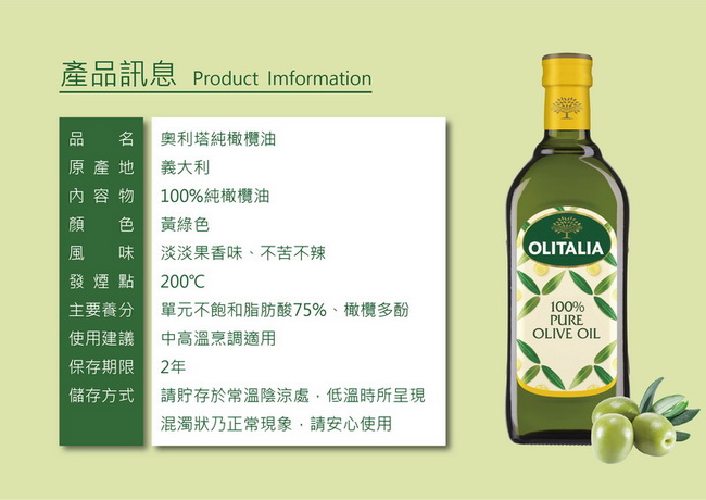 規格容量: 1000ml/瓶(暗色玻璃瓶裝) 本組產品內容: Olitalia奧利塔純橄欖油1000ml/瓶 x2入 附贈一只Olitalia精美禮盒+料理小食譜 保存期限:依製造日起24個月 保存方式:常溫儲存,避免陽光直射