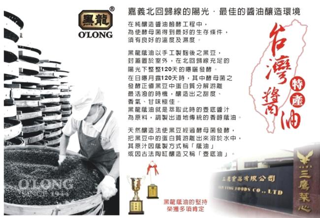 品牌簡介: 黑龍品牌創立於西元1944年,一甲子的健康美味,黑:代表「穩重」、龍:代表「尊貴」 運用的琥珀色,就如同黑龍遵循古法的手工純釀醬色,樸實卻富有傳統的台灣文化精神。
