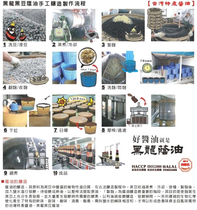 製程說明: 在純釀造醬油醱酵工程中,為使酵母菌得到最好的生存條件,須有良好的溫度及濕度。 黑龍蔭油以手工製麴後之黑豆,封蓋置於室外,在北回歸線充足的陽光下整整120天的曝曬發酵, 在日曝月露120天時,其中酵母菌之發酵正值黑豆中蛋白質分解游離最活潑的時機,黑龍蔭油就是 萃取此時的壺底醬汁為原料,調製出道地傳統的香醇蔭油。