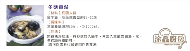 「黑龍壺底油」是由100%黑豆經古法120天日曝月露天然釀造而成。 壺底原汁純度高,味道香濃,口感甘醇獨特,為調味醬中之極品。 原色蔭油,不加醬色。 不含防腐劑、味精、糖精、人工色素。 參考料理: 滷、煮、炒、沾、拌、烤、醃皆宜。