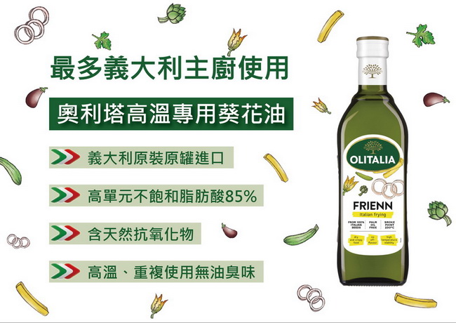 ★品牌簡介: (Olitalia)奧利塔品牌為義大利莫里尼(Cremonini)集團事業體傑出之代表,成立超過半世紀,為義大利暢銷大品牌 行銷世界137個國家,嚴選義大利中部托斯卡尼地區綠橄欖品種, 國家級專業認證橄欖油品評師品管檢驗 為您重新詮釋嗅覺.味覺.視覺的頂級標準,讓您輕鬆居家品嚐義大利