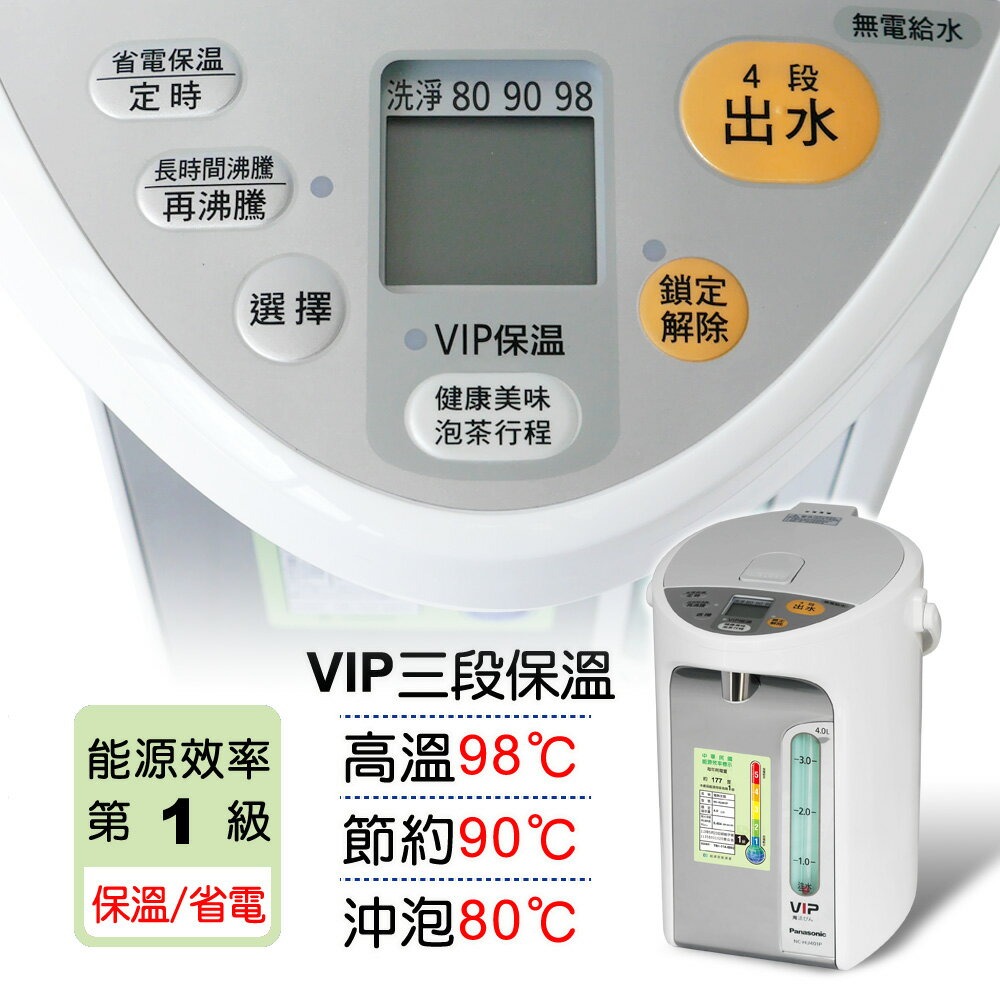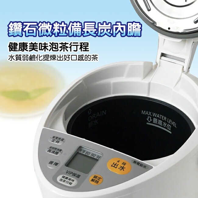 商品特色 *U-VIP真空斷熱,省電、省能源 *健康美味泡茶行程 *鑽石微粒備長炭內膽,不沾黏、易清洗 *四段出水出水量控制得心應手 *無電給水(內置充電電池) *4/6/8/10小時省電定時 *3段保溫選擇 *液晶顯示一目了然 *無水防空燒自動斷電 *360度旋轉設計