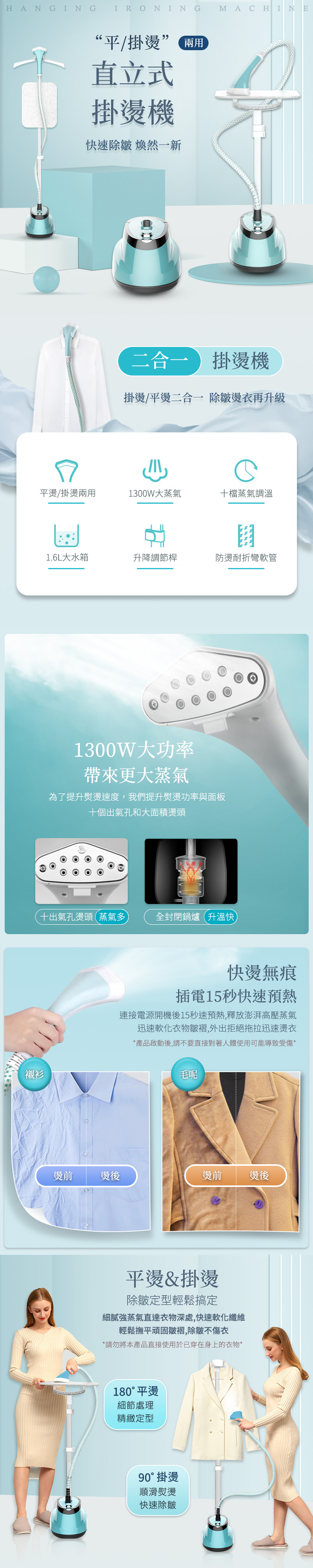 品名:平/掛燙兩用直立式掛燙機 型號:SC1 材質:塑料+鋁+不鏽鋼 顏色:夕霧藍 尺寸:70x41.5x30.5cm(最矮) 142x41.5x30cm(最高) 重量:2660g 電壓:110V 瓦數:1300W 容量:1.6L 檔位:10檔調溫 線長:155cm 預熱時間:15秒 包裝尺寸:38.2x33x28cm 包裝重量:3690g 產品內容:主機x1/可調式升降桿x1/蒸氣軟管x1/衣架x1/噴頭掛架x1 熨燙架x1/隔熱手套x1/熨燙板x1/說明書x1/保固卡x1 產品保固:非人為因素損壞主機保固3個月 產地:中國 以上規格有任何說明錯誤依原廠公告為主 注意事項: 1.本商品功耗高達1300W,如需使用延長線,請確認延長線可承受1650W,且不可與其他電器一併使用。 2.加水時請確實關閉開關並移除插頭,插座周遭請避免水源。 3.產品啟動後,請不要直接對著人體使用可能導致受傷。 4.不使用時請拔除電源插頭。 5.插電中請勿加水,水箱中請勿加入熱水,會導致水箱變形。 6.請勿在加熱中觸摸燙頭以免熱傷。 7.產品通電時請勿離開。