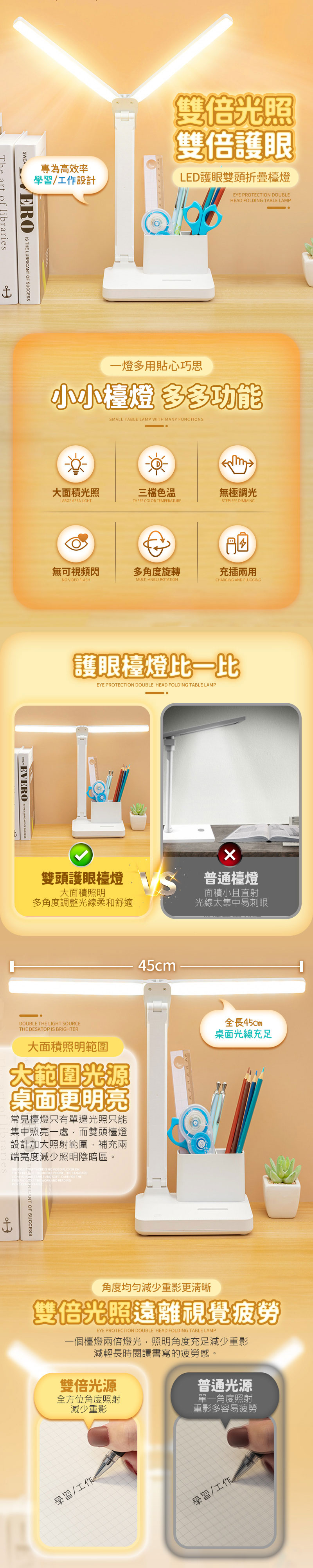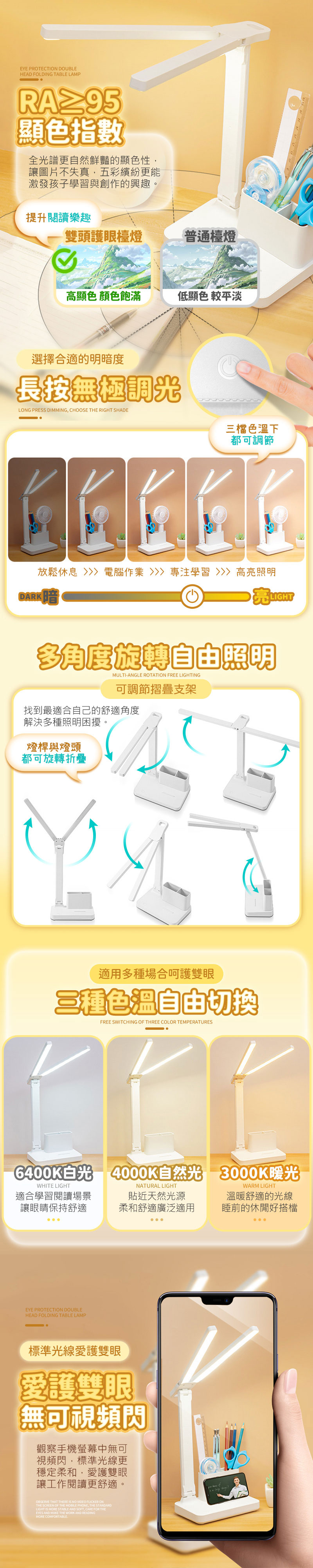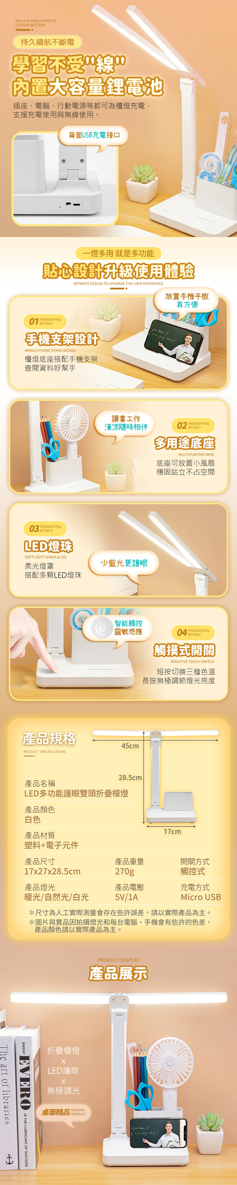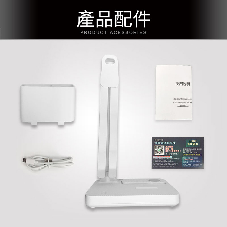 品名:多功能LED護眼雙頭折疊檯燈 型號:TD2 材質:塑料+電子元件 顏色:白色 尺寸:17x27x28.5cm 重量:270g 電壓:5V/1A 瓦數:5W 色溫:3000-6400K 亮度:無極調光 燈光:暖光/自然光/白光 開關方式:觸控式 充電方式:Micro USB 光源類型:LED燈珠 包裝尺寸:30x19.8x5.5cm 包裝重量:430g 商品內容:檯燈x1/電源線x1/多用途底座x1/說明書x1/保固卡x1 商品保固:非人為因素損壞主機保固3個月 商品產地:中國 以上規格有任何說明錯誤依原廠公告為主 注意事項: 1.使用中眼睛請不要直視燈源避免發生危險。 保固範圍 3個月保固期 保固單位:代理商(長江科技) 保固方式:非人為因素將可享有免費保固,若經代理商判斷為人為因素將酌收維修費用。 【以下狀況恕不在保固內】: ◆因泡水、撞擊、刮傷、拉扯過度所造成之損壞者。 ◆自行拆解或保固標籤毀損不明者。
