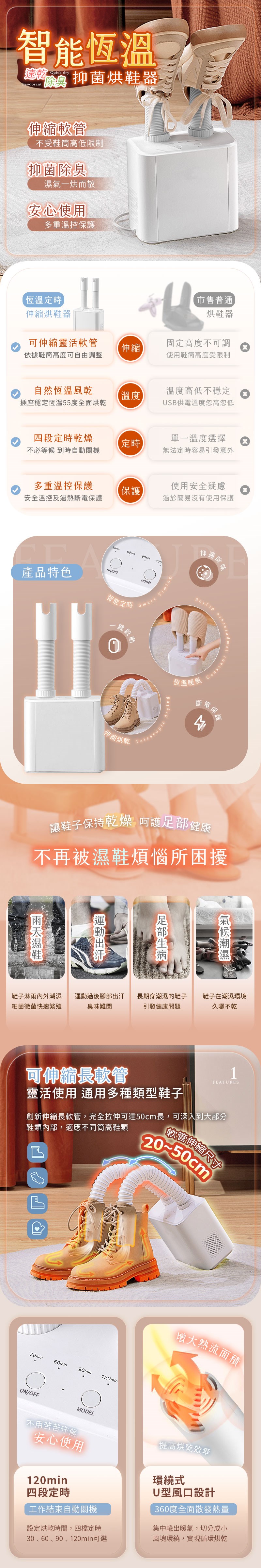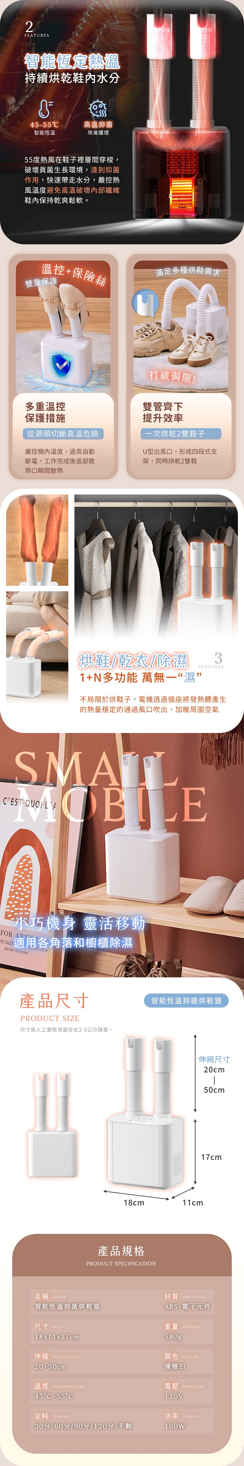 品名:智能恆溫抑菌可伸縮烘鞋器 型號:SD-3 材質:ABS+電子元件 尺寸:18x11x17cm 伸縮尺寸:20~50cm 重量:580g 顏色:優雅白 電壓:110V 功率:160W 定時:30分/60分/90分/120分/手動 發熱溫度:45°C~55°C 包裝尺寸:20x16.8x18.7cm 包裝重量:955g 商品內含:主機x1/伸縮軟管x2/說明書x1/保固卡x1 保固期:主機保固三個月,憑發票保固 產地:中國 ※注意事項: 1.請勿於鞋內積水時直接使用。. 2.應避免幼童碰觸並禁止使用本產品。 3.烘鞋時間不建議烘整晚,可能會導致脫膠。 4.若烘鞋器沒有放入鞋內,則溫度會無法聚集,影響烘乾效能。 5.使用中請勿將電源線壓在烘鞋器下,或將電源線纏繞在產品上,以避免損壞。
