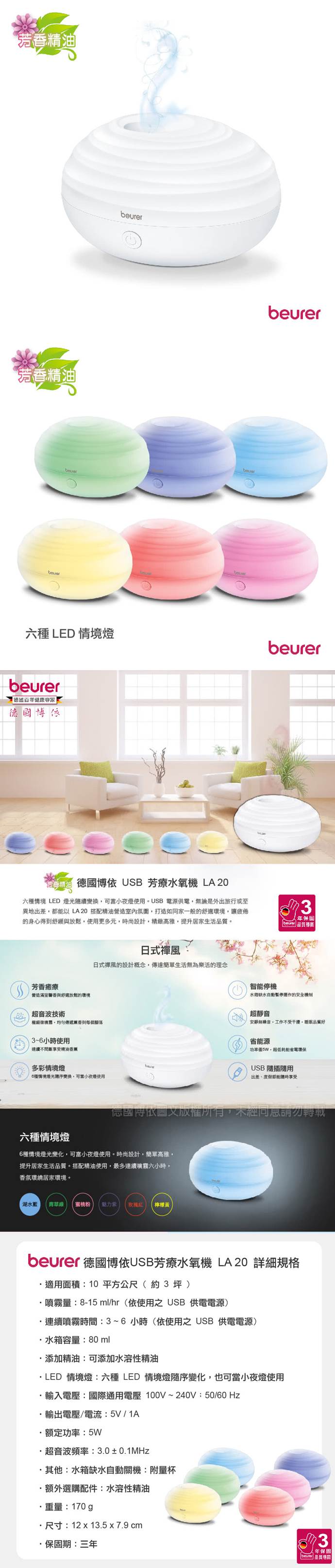 適用面積:10 平方公尺 ( 約 3 坪 ) 噴霧量:8-15 ml/hr (依使用之USB供電電源) 連續噴霧時間:3 ~ 6 小時 (依使用之USB供電電源) 水箱容量:80 ml 添加精油:可添加水溶性精油 LED 情境燈:六種 LED 情境燈隨序變化,也可當小夜燈使用 輸入電壓:國際通用電壓 100V ~ 240V;50/60 Hz 輸出電壓/電流:5V / 1A 額定功率:5 W 超音波頻率:3.0 ± 0.1MHz 其他:水箱缺水自動關機:附量杯 額外選購配件:水溶性精油 重量:170 g 尺寸:12 x 13.5 x 7.9 cm 保固期:三年