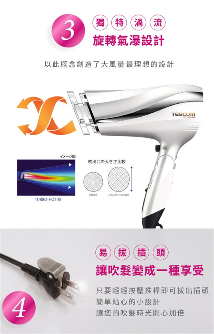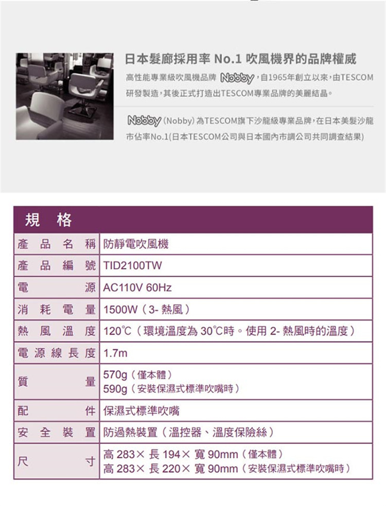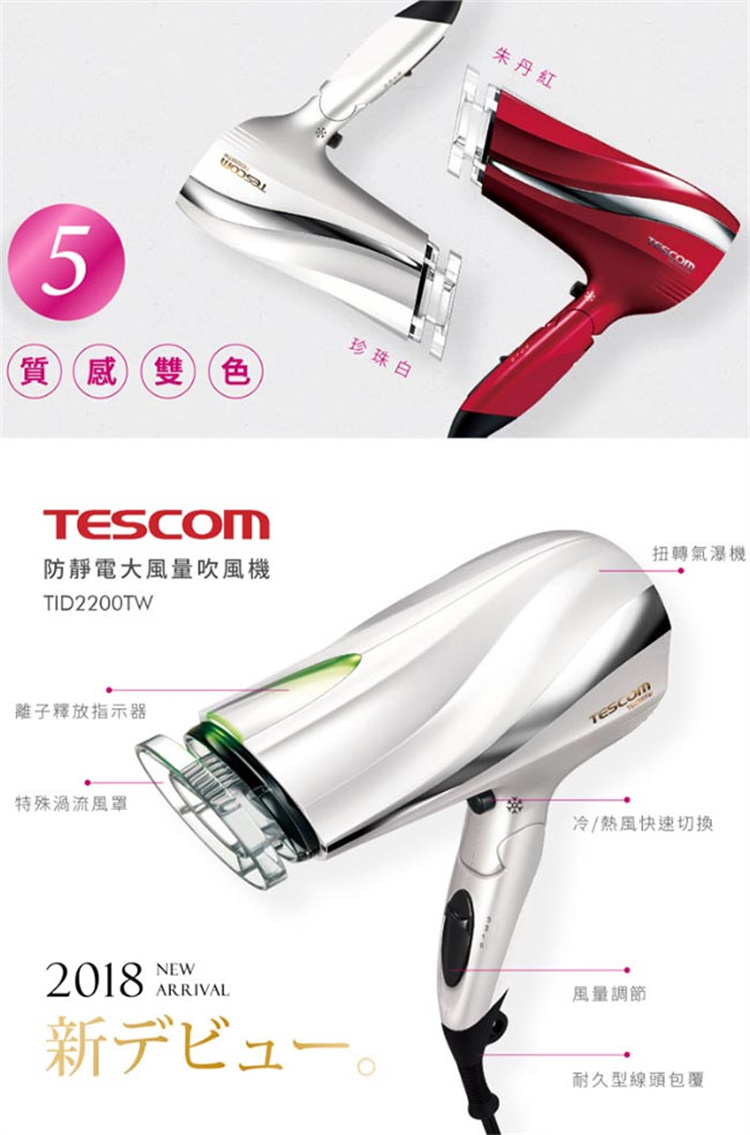 產品名稱:防靜電吹風機 產品型號:TID2200TW 電源:AC 110V 60Hz 顏色:朱丹紅(RD) 安全裝置:防過熱裝置 (溫控器、溫度保險絲) 保固:原廠保固一年,附保固證書一張 總代理:群光電子股份有限公司 客服專線:0800255123 商檢字號:R31310