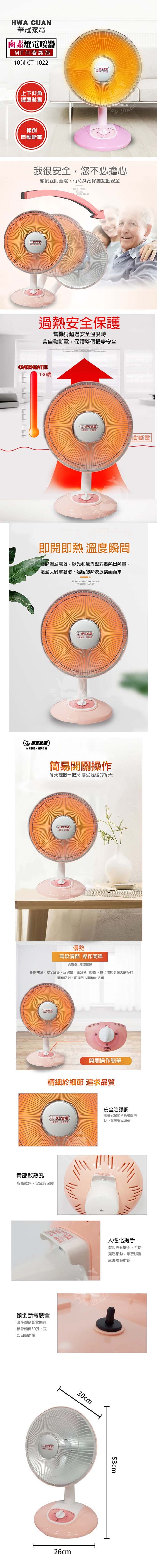 華冠 10吋鹵素燈電暖器 CT-1022 台灣製 ■ 台灣製造,品質有保證 ■ 採用鹵素燈管,瞬間發熱 ■ 兩段調節,操作簡單 ■ 傾倒自動斷電,過熱安全保護 ■ 高效率速暖更省電 ■ 上下仰角度可調整 ■ 擺頭120度,幅度廣大 ■ 自動旋轉 ■ 安全防護網,細密網罩絨毛前網,防止碰觸造成燙傷 ■ 人性化提手,方便提起移動