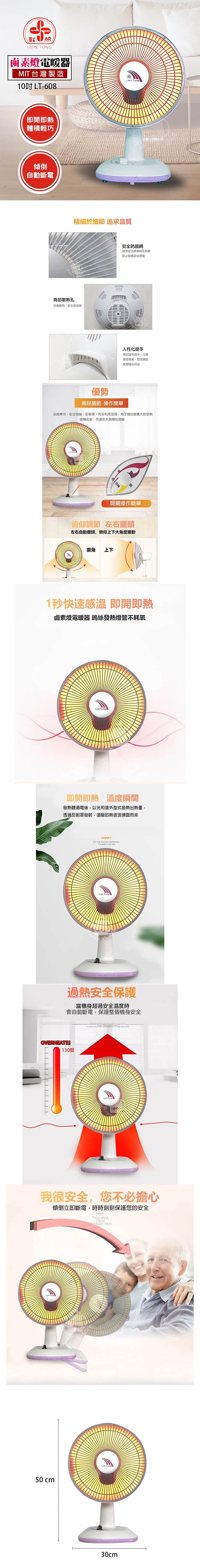 聯統 10吋鹵素燈電暖器 LT-608 台灣製 ■ 台灣製造,品質有保證 ■ 鹵素燈電暖器 ■ 瞬間發熱,快速感溫即時保暖不需等待 ■ 可上下仰俯角度調整,左右擺動 ■ 傾倒自動斷電裝置 ■ 30公分取暖面 ■ 旋轉式開關450W ■ 護網面植絨毛不燙 ■ 鎢絲發熱燈管不耗氧