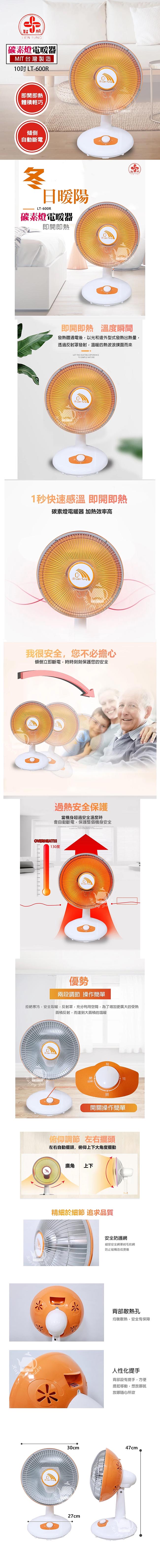 聯統 10吋碳素燈電暖器 LT-600R 台灣製 ■ 台灣製造,品質有保證 ■ 優質碳素燈,瞬間發熱 ■ 自動旋轉 ■ 兩段式開關 ■ 人性化把手設計 ■ 傾倒安全開關裝置 ■ 即開即熱 ■ 可上下俯仰角 左右擺頭 ■ 網面植絨防燙 ※Q&A :首次使用時為什麼會有白煙和燒焦臭味? →因為網子上面有防燙絨毛,剛開始使用時會把一些雜質揮發掉,所以一開始使用這樣是正常的,開機一段時間後味道就會自動消散