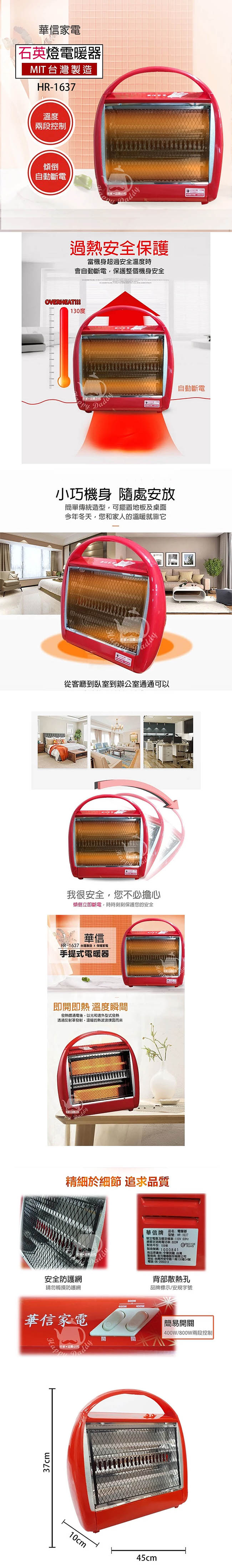 華信 手提式桌上型石英管電暖器 HR-1637 台灣製 ■ 台灣製造,品質有保證 ■ 即開即熱,溫度瞬間 ■ 小巧機身,隨處安放 ■ 兩段式開關400W/800W ■ 傾倒安全開關裝置 ■ 過熱安全保護 ■ 安全防護網 ■ 人性化提手,移動方便