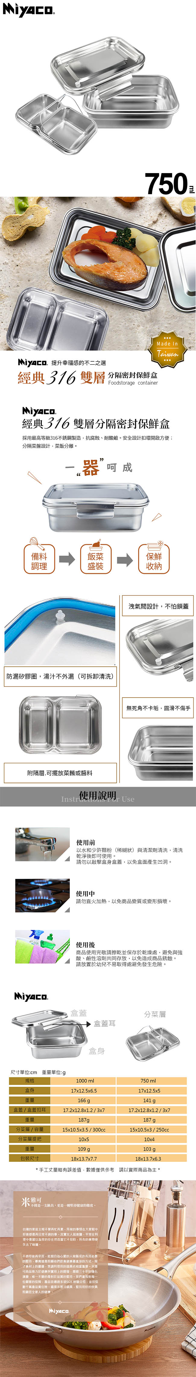 米雅可 經典316雙層分隔密封保鮮盒17cm(750ml) MY-G10T171 台灣製 ■ 台灣製造 ■ 高等級316不鏽鋼,抗腐蝕、耐酸鹼 ■ 安全設計扣環開啟方便 ■ 分隔菜盤設計,菜飯分離 ■ 分隔菜盤,可擺放菜餚或醬料 ■ 防漏矽膠圈,湯汁不外漏(可拆卸清洗) ■ 洩氣閥設計,不派鎖蓋 ■ 無死角不卡垢,圓滑不傷手