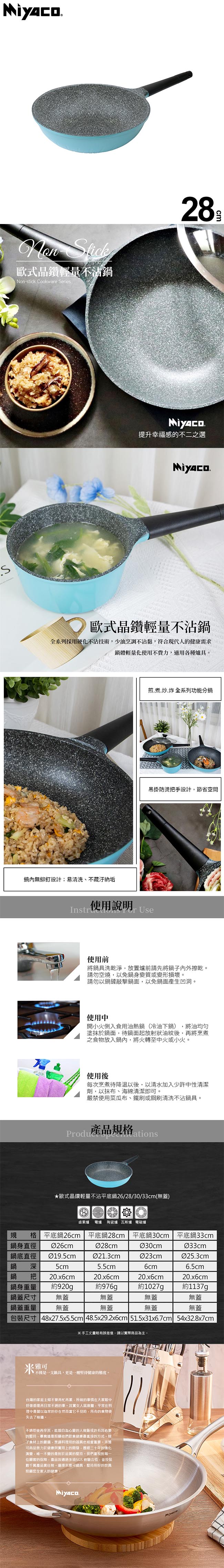 米雅可 歐式晶鑽輕量不沾平底鍋28cm(無蓋) MY-2028F-1 台灣製 ■ 台灣製造 ■ 無鉚釘設計,鍋身高強度硬化處理,耐磨又耐用 ■ 輕量化設計,單手即可掌控,操作輕鬆自如 ■ 導熱迅速,低油煙烹煮,適用電磁爐 ■ 手把可吊掛收納,可使用金屬鍋鏟 ■ 適用鹵素爐、電爐、陶瓷爐、瓦斯爐、電磁爐等爐具