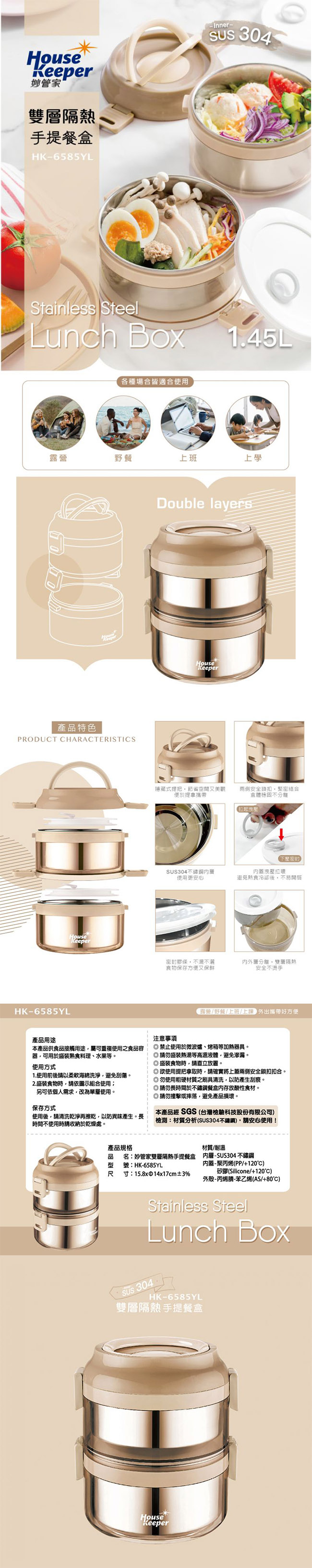 妙管家 304不鏽鋼雙層隔熱手提餐盒1.45L(暖茶色) HK-6585YL ■ 可分離#304不鏽鋼內層,雙層隔熱安全不燙手 ■ 上蓋兩側安全鎖扣設計,附提把,攜帶便利 ■ 內蓋洩壓拉環,避免熱食冷卻不易開啟 ■ 室內、室外、旅遊、野餐,食物保鮮必備 ■ 兼具環保與便利性 ■ 也可依個人需求改為單層使用
