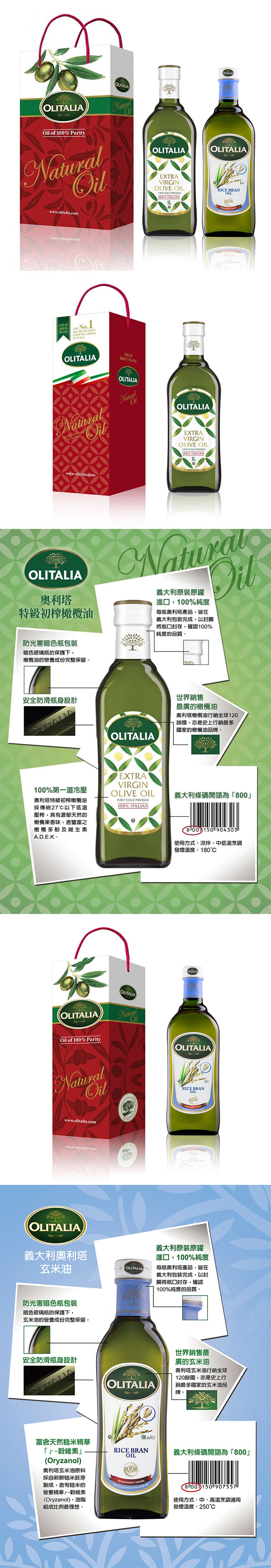 Olitalia 奧利塔 特級初榨橄欖油1000ml+玄米油1000ml禮盒組 Olitalia奧利塔特級初榨橄欖油1000ml 奧利塔特級初榨橄欖油,完全不經過人工雕琢,這樣自然的呈現方式,可以透過它本身帶有的濃郁果香味,由嗅覺感受到心裡。 為橄欖油裡的最高等級第一道初榨橄欖油,唯有經手工現採24小時內壓榨成油,在整個壓榨過程中保持在25度C以下,以保留橄欖油原始的營養及風味,且不經任何人工或化學加工就直接裝瓶販售的橄欖油,才能在正面標籤寫上Extra Virgin的等級名稱,以表示第一道初榨橄欖油的優越品質。 ■ 第一道冷壓初榨Extra Virgin等級 ■ 單元不飽和脂肪酸含量75% ■ 廚房不黏膩、無煙害 ■ 濃郁橄欖果香味 ■ 義大利原裝進口 ■ 單元不飽和脂肪酸:75% ■ 發煙點180℃ ■ 涼拌、冷淋中、低溫料理適用 Olitalia奧利塔玄米油1000ml ■ 富含天然糙米精華 ■ 採自新鮮糙米胚芽製成 ■ 油脂組成比例最理想 ■ 適合中、高溫烹調 三大承諾: 1.義大利原裝進口 2.純度100% 3.ISO 9001認證通過