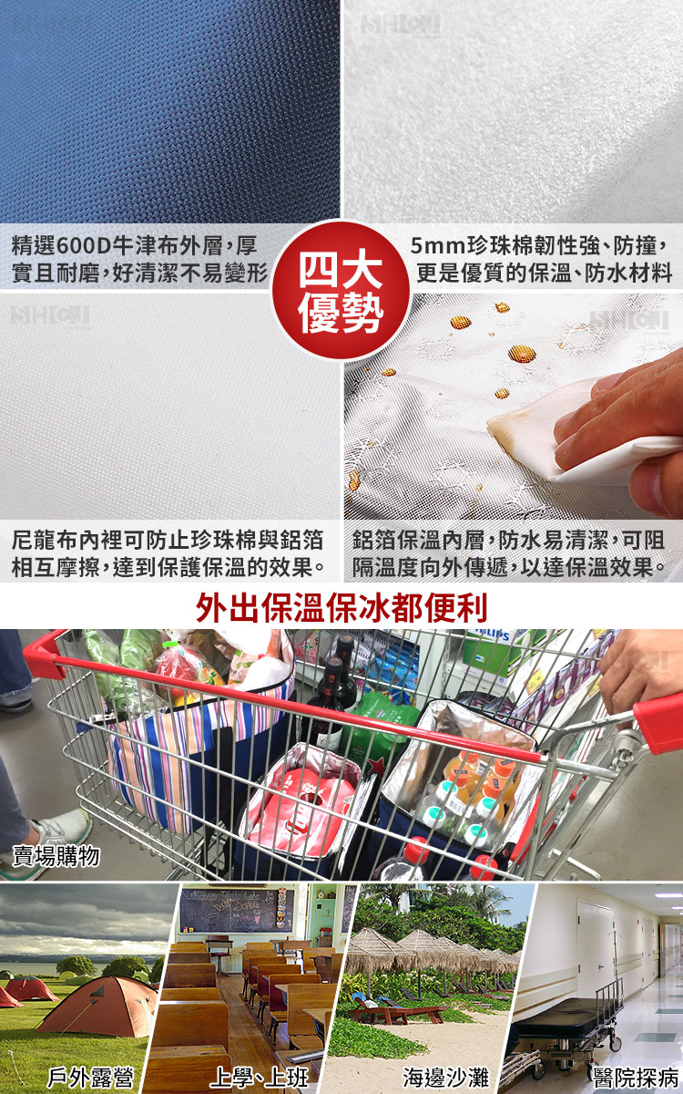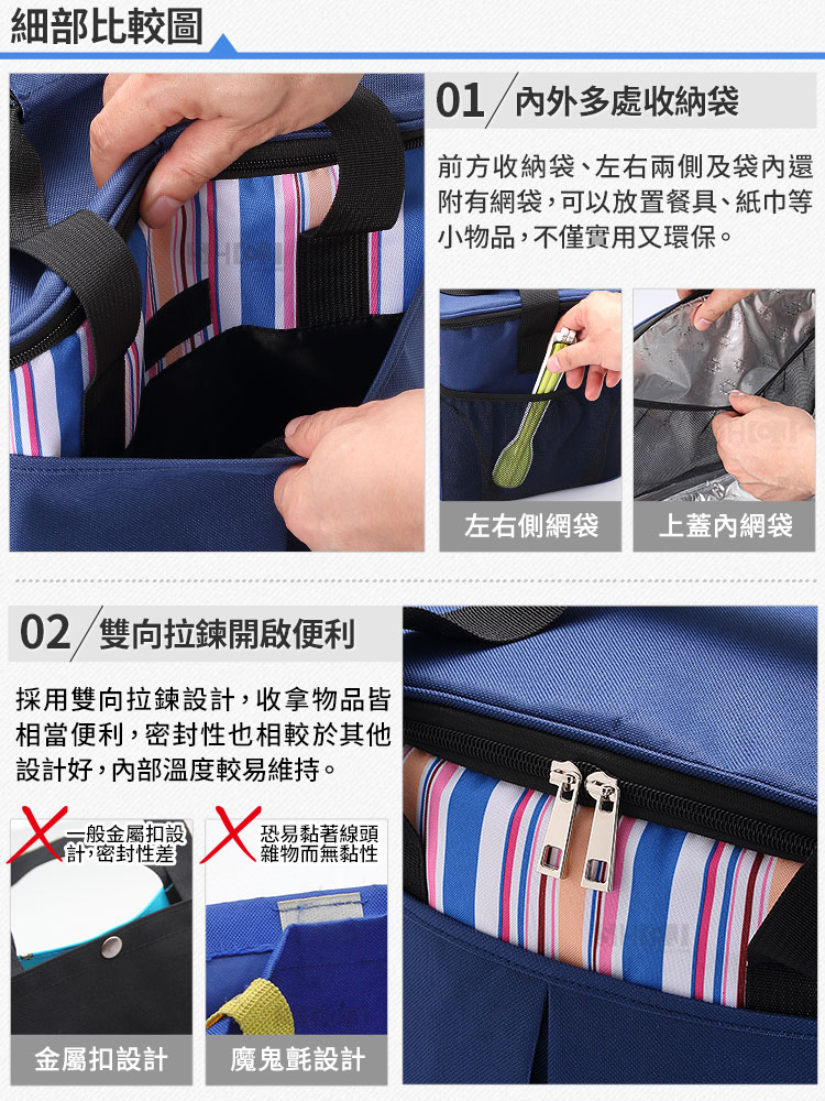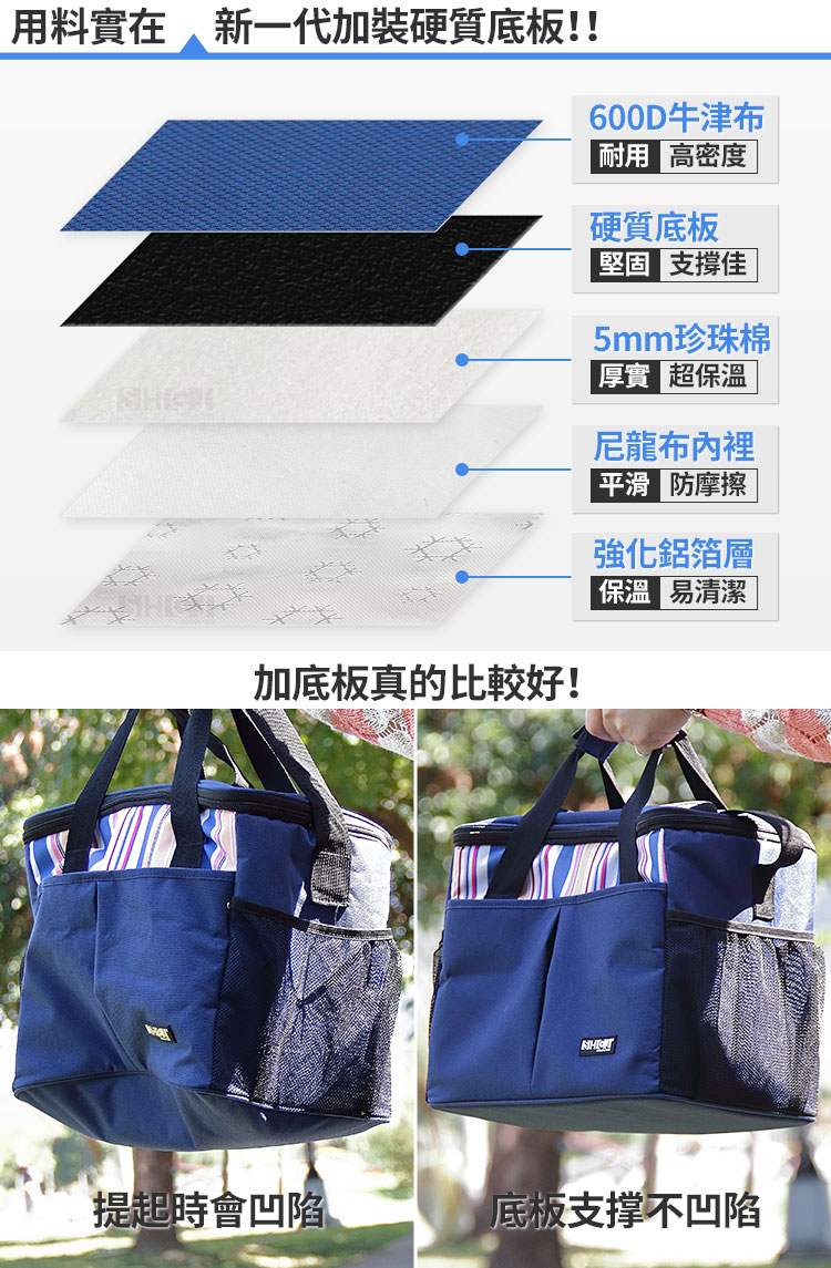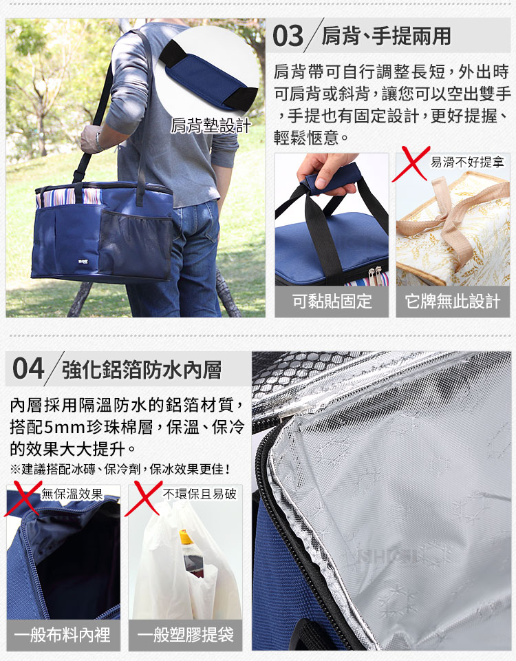 ◆容量:約30公升,大寬口、大容量,使用更便利。 ◆新一代加裝硬質底板,重物提取時底部較不會凹陷。 ◆外層採用精選600D牛津布,厚實耐磨,好清潔不易變形。 ◆內層採用鋁箔+5mm珍珠棉保溫層,阻隔溫度向外傳遞,強化保溫效果。 ◆保溫袋可保溫/可保冷,雙效保鮮,攜帶過程中可延長食物新鮮度。 ◆可折疊收納,不佔空間;雙向拉鍊,易開易合,內部溫度易維持。 ◆保溫袋內外多處收納空間,可放置餐具、紙巾等小物品,實用又環保。 ◆可肩背/手提,可空出雙手,攜帶更加舒適、便利,走到哪裡用到哪裡。 ◆不管是外出郊遊、野餐、露營,還是購物、買菜..等都可隨身攜帶。 ◆內部大容量,可放置多瓶飲料、多種食材或是餐盒等,物品外出好收納。 ◆愛地球減少塑膠袋的使用,建議多多使用保溫袋讓環境更乾淨、環保。 ◆外觀新穎實用,適合各年齡層使用,方便收納,不佔空間,外出帶著走。