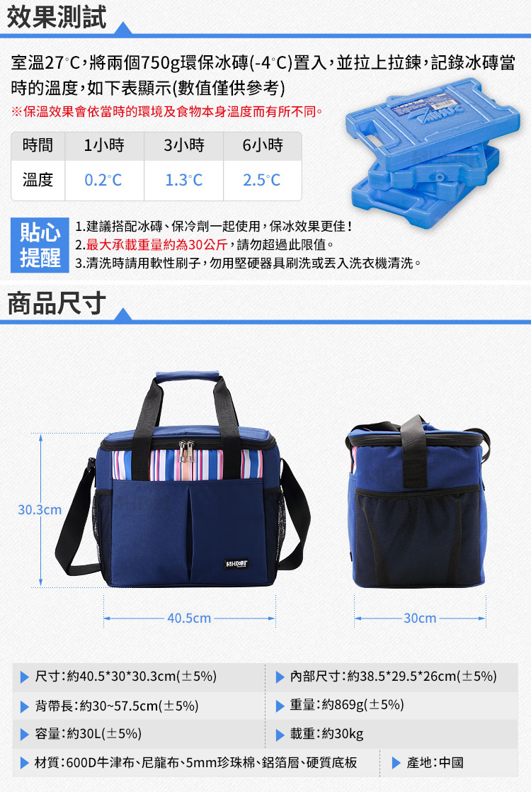 1.尺寸:約長40.5*寬30*高30.3cm(±5%) 2.內部尺寸:約長38.5*寬29.5*高26cm(±5%) 3.材質:600D牛津布、尼龍布、鋁箔、5mmEPE珍珠棉 4.容量:約30公升(±5%) 5.重量:約869g(±5%) 6.產地:中國 7.承載重量:30kg