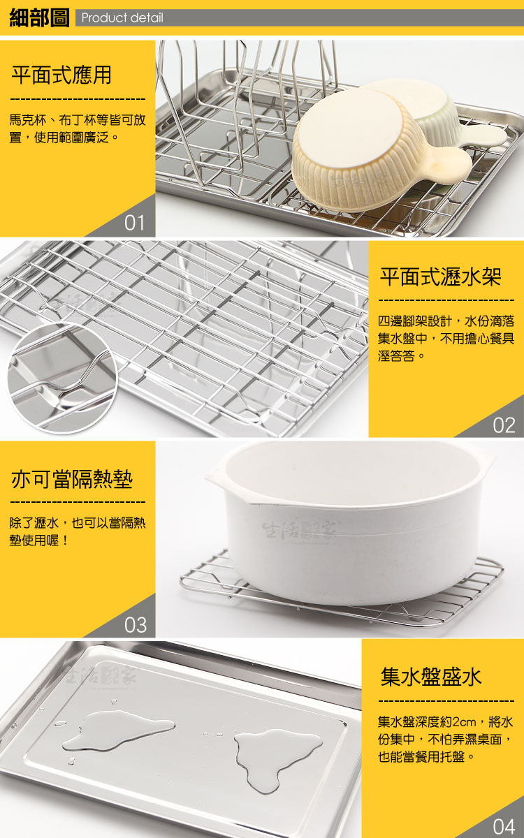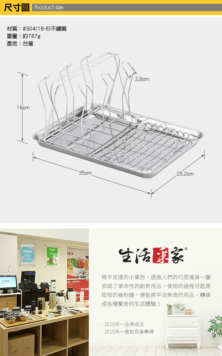 1.尺寸:約寬35*深25.2*高18cm 2.材質:#304(18-8)不鏽鋼 3.重量:約787g(組) 4.產地:台灣 5.商品:瀝水杯架*1、平網*1、瀝水盤*1