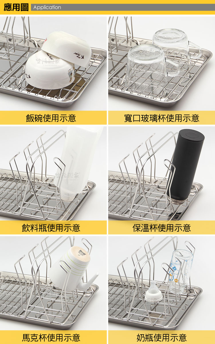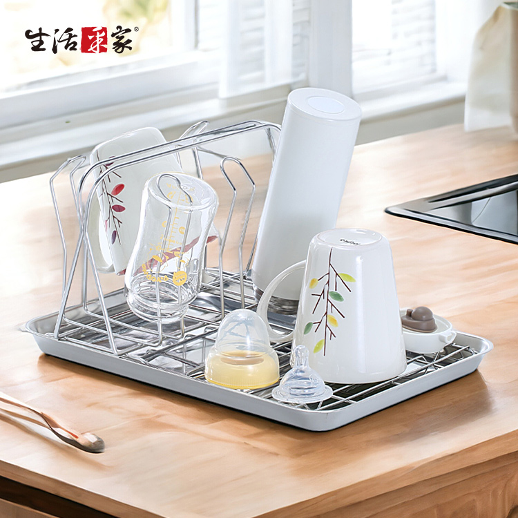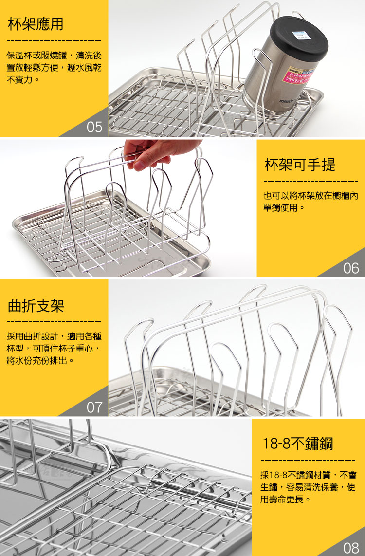 清洗完畢的杯子或奶瓶沒有地方瀝乾嗎?? ◆杯架+平網,用途更廣,長型水杯或馬克杯都可適用。 ◆採18-8不鏽鋼材質,不會生鏽,容易清洗保養,經久耐用。 ◆表面不電鍍,直採採用不鏽鋼本色,無重金屬殘留,安全可靠。 ◆全架採不鏽鋼材質,不會因日照變質損壞脆裂, 使用壽命更長。 ◆6支杯架設計,不管是您家中的水杯或是小寶貝的奶瓶都可以瀝水風乾。 ◆瀝水盤可當成餐用拖盤;水杯架可放在櫥櫃中用來收納各式水杯,單獨使用。
