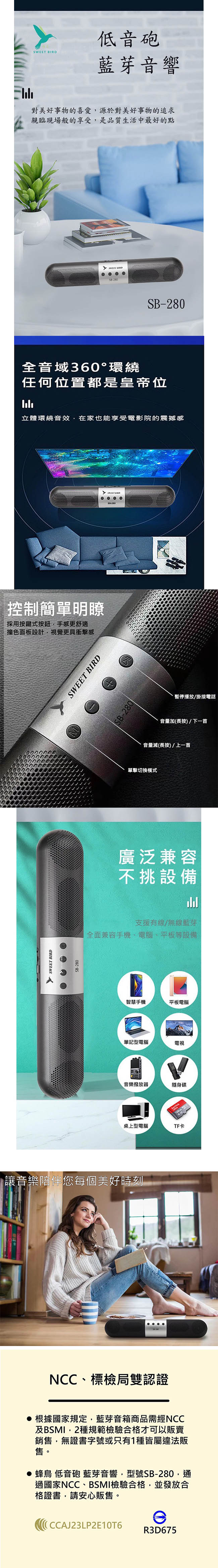 SWEET BIRD蜂鳥 低音砲 藍牙音響 SB-280 蜂鳥 低音砲 藍芽音箱 SB-280,是您隨處享受高品質音樂的理想之選。這款音箱結合了先進的技術和令人驚嘆的設計,為您帶來前所未有的音樂體驗。 ■ 小體積,大容量 ■ 藍牙5.0 ■ 傳輸範圍達10米:藍芽技術無縫連接,讓您在10米範圍內自由移動,享受音樂不受拘束。 ■ 高容量TF卡支援:最高支援32GB的TF卡,輕鬆存儲您喜愛的音樂,隨時隨地播放您喜歡的歌曲。 ■ 多功能播放支援:支援MP3格式,可播放隨身碟中的音樂內容,為您帶來更多聽覺享受。 ■ 控制簡單明瞭,採用按鍵式按鈕,手感更舒適 撞■ 色面板設計,視覺更具衝擊感 ■ LED七彩循環燈:隨著音樂的節奏和旋律,LED燈會逐漸變換出不同的炫彩,為您的音樂體驗增添視覺上的享受。 ■ 四單元發聲,劇院級音質: 擁有四個高品質發聲單元,提供清晰細膩的音質和強大的低音效果,營造出身歷其境的劇院級音效。 ■ 重低音震撼音效 ■ 支援有線/無線藍牙全面兼容手機、電腦、平板等設備 ■ USB供電 ■ 安全認證保障:通過國家通訊委員會NCC認證及經濟部標準檢驗局BSMI認證