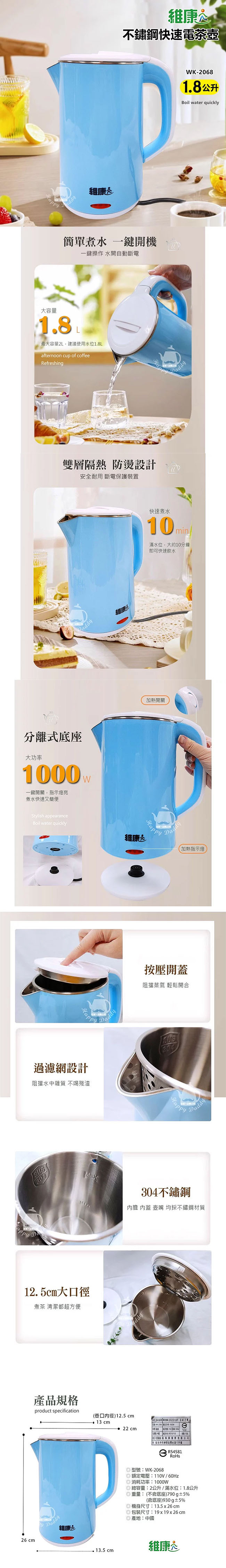維康 雙層防燙304不鏽鋼內膽快煮壺1.8L WK-2068 ■ 內膽、內蓋、壺嘴採304不鏽鋼材質 ■ 安全耐用無異味 ■ 雙層隔熱防燙設計,一體成形內膽 ■ 安全防燙 ■ 壺內蓋防漏設計,水蒸氣不溢出 ■ 出水口流通網設計,阻擋水中雜質 ■ 360度旋轉加熱底盤,可分離,清洗水壺方便 ■ 安全斷電保護裝置