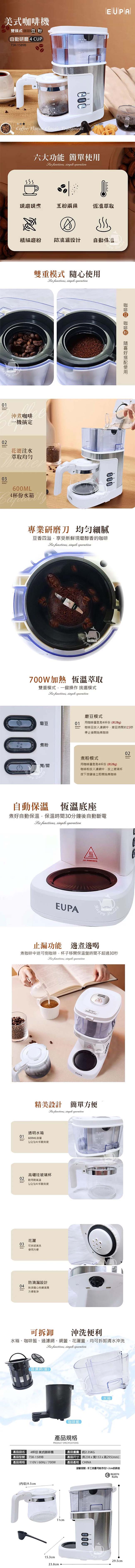 EUPA優柏 4杯份自動研磨美式咖啡機 TSK-1589B ■ 沖煮研磨咖啡,一機搞定 ■ 雙模式設計,咖啡豆咖啡粉都可用 ■ 按鈕操作,簡單上手 ■ 可拆式配件,清潔便利 ■ 花灑注水,萃取更均勻 ■ 自動保溫30分鐘 ■ 止漏設計,中途可倒咖啡