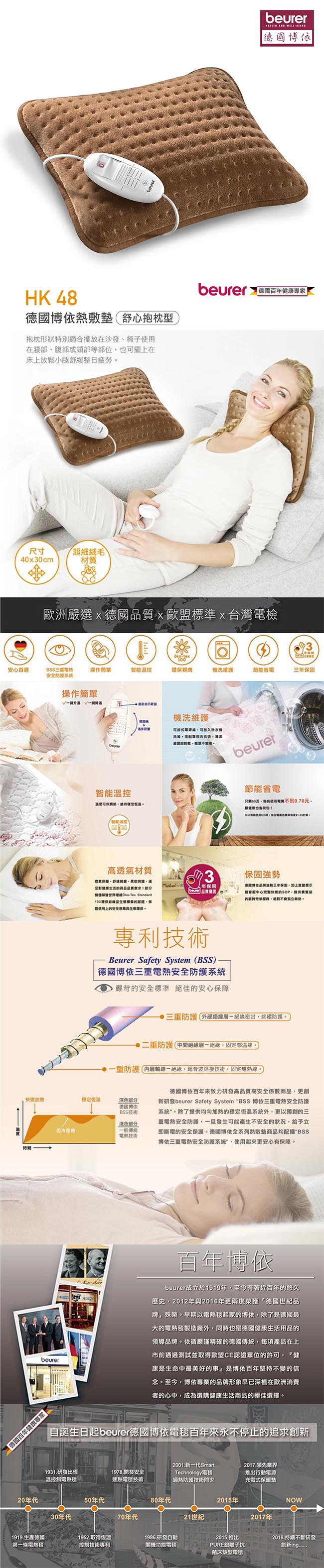 德國博依beurer 舒心抱枕型熱敷墊 HK48 ■ 德國博依三重電熱安全防護系統(BSS) ■ 三段溫度選擇 ■ 創新電源線系統:可拆式電源線 ■ 清潔方式:枕套熱敷墊可單獨機器洗滌 ■ 可自行更換內裡抱枕,不開機時可當一般抱枕使用 動力式熱敷墊警語: (一)禁止使用於嬰兒 (二)禁止使用於癱瘓者及對溫度感覺遲鈍者,例如孕婦,糖尿病患等 (三)禁止使用於熟睡者或無意識患者 (四)請勿於易燃環境下,或鄰近充滿氧氣及氧氣儲存設備旁使用 (五)請勿坐或壓在熱敷墊上 (六)請勿以強力壓折及扭曲方式使用或收納熱敷墊 (七)請勿以拉扯電線方式拔去插頭 (八)請勿以別針或其他金屬物品固定熱敷墊,以避免觸電