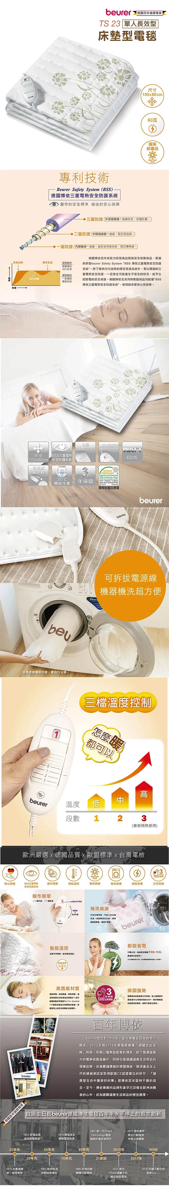 德國beurer博依 三段溫控單人長效床墊型電熱毯(150x80cm) TS23 匈牙利製 ■ 三段溫度控制 ■ 可拆式電源線,可機器洗滌 ■ 三重電熱安全防護系統 BSS ■ 過熱自動斷電 安全無慮 ■ 3段溫控 X 長效型(無定時關機) ■ 單人適用(150x80cm) ■ 可下水機洗 輕鬆保養 (可拆式溫控器) ■ 環保紡織品