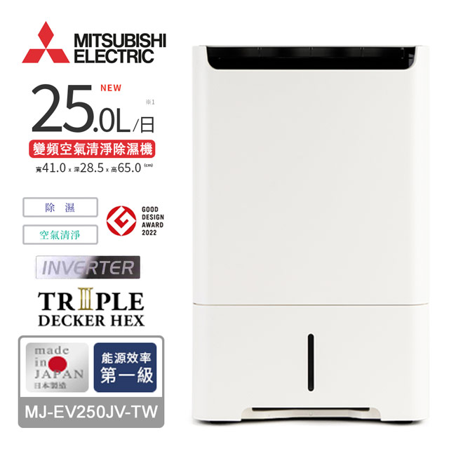 商品型號:MJ-EV250JV-TW 顏色:白 除濕方式:變頻式壓縮機 能源因數值(EF值)(L/KWh):2.54 CASR值:0.67cmm 適用室溫範圍:5℃~40℃ 標準除濕坪數:16~32坪 消費電力:410W 除濕運轉音(強/靜音):42/34dB 空清運轉音(強/靜音):33/24dB 水箱容量:5.5L 本體重量:18.9kg 本體尺寸:410寬x285深x650高mm 外箱尺寸:510寬x385深x705高mm 國際條碼:4902901791710 產地:日本 BSMI:R32174 除濕能效分級:1級 空氣清淨能效分級:5級