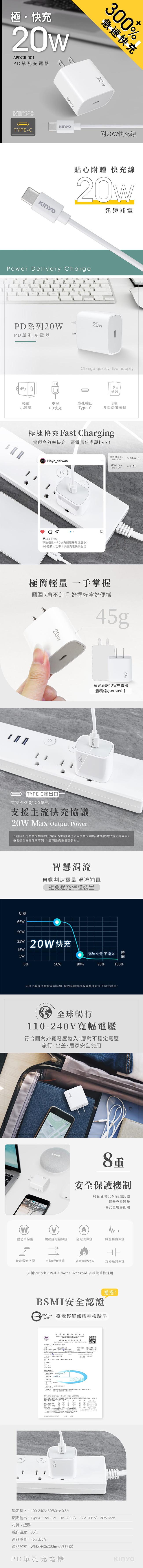 主商品:充電組x1 額定輸入:100-240V~50/60Hz 0.6A 額定輸出: Type-C:5V 3A 9V 2.22A 12V 1.67A 20W Max 操作溫度:35℃ 線材傳輸規格:20W(12V?1.67A) 線材長度:1.5m±3% 產品尺寸:W58xH43xD28mm(含插頭) 產品材質:金屬、塑膠 BSMI:R4A106 產地:中國 保固說明:非人為因素之損壞,原廠保固1年 以上規格±5% ※依照消費者保護法的規定,享有猶豫期的權益。 ※猶豫期並非試用期,所以您所退回的商品必須是全新的狀態、而且完整包裝(不得有刮傷、不得有使用水漬…等)。 ※請注意保持商品本體、配件、贈品、保證書、原廠包裝及所有附隨文件或資料的完整性,切勿缺漏任何配件或毀損原廠外盒。 ※若有遺失或汙損,將會視情況酌收相關費用。