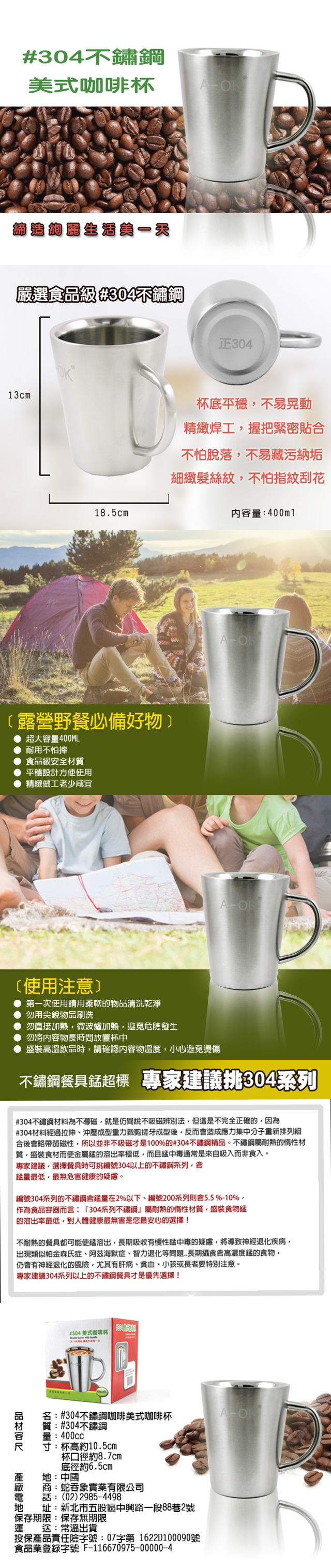 品 名:#304不鏽鋼美式咖啡杯 材 質:#304不鏽鋼 容 量:400cc 尺 寸:杯高約10.5cm,杯口徑約8.7cm,底徑約6.5cm 產 地:中國 工 廠:蛇吞象實業有限公司 電 話:(02)2985-4498 地 址:新北市五股區中興路一段88巷2號 投保產品責任險字號:新光產物130007AKP0000947號 食品業登錄字號 F-116670975-00000-4