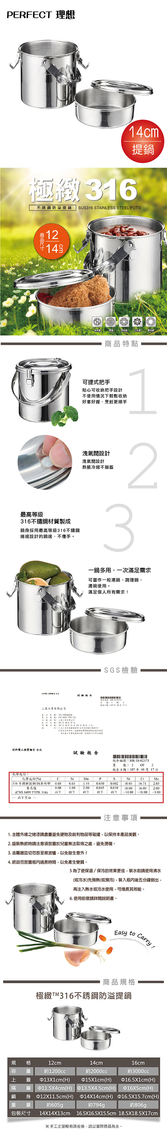 理想PERFECT 極緻316不鏽鋼防溢提鍋14cm KH-53114 ■ 貼心可收納把手設計 ■ 洩氣閥設計,熱漲冷縮不鎖蓋 ■ 最高等級316不鏽鋼製成 ■ 捲邊設計的鍋邊,安全不傷手 ■ 可做一般湯鍋、調理鍋、湯碗使用 ■ 台灣製造,在地品牌,品質有保障 ■ 產品通過SGS檢驗合格