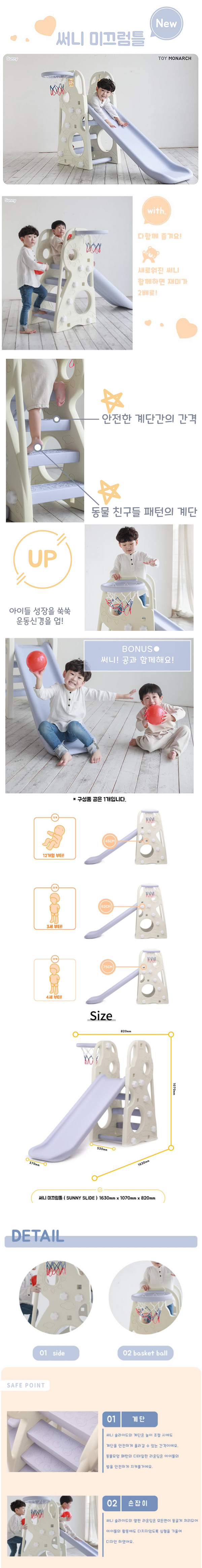■ 韓國製造 ■ 附設籃框 ■ 使用抗UV材質 ■ 組裝簡易、結構穩固耐用 ■ 滑道和階梯為淡紫色,典雅好看 ■ 三段式可調滑道高度,可依幼兒體型調整 ■ 適用年齡:1歲以上