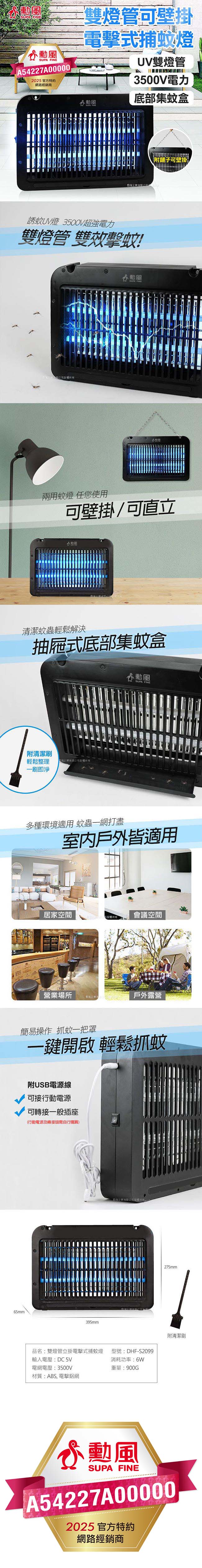 勳風 雙燈管電擊式兩用捕蚊燈 DHF-S2099 ■ 雙燈管捕蚊,強效加倍 ■ 底部抽屜式集蚊盒,附清潔刷,輕鬆整理 ■ 360度環繞式電擊網 ■ 誘蚊UV燈管,3500V瞬間超強電力 ■ 可接行動電源,附USB電源線(行動電源和轉接頭需自備) ■ 連續電擊安全不發熱 ■ 室內戶外皆適用 ■ 可直立/可壁掛,附鏈子可壁掛 ■ 本產品無內建充電電池