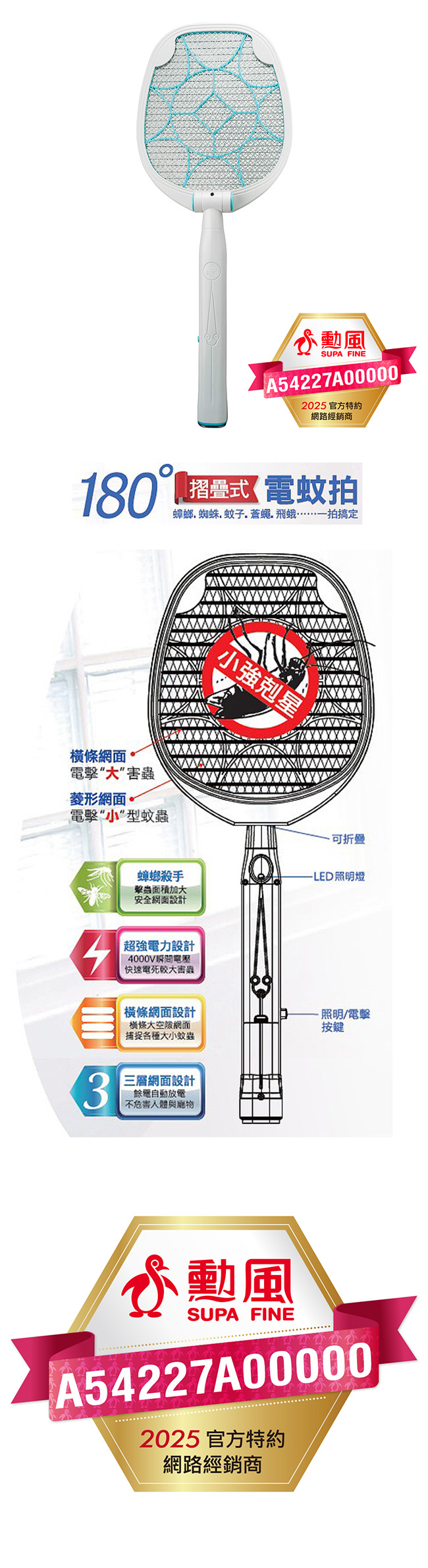 勳風 180度折疊式捕蚊蟑拍 HF-D729A ■ 擊蚊網面大 ■ 三層安全網面 ■ 4000V超強電力 ■ 橫條網面電擊大害蟲