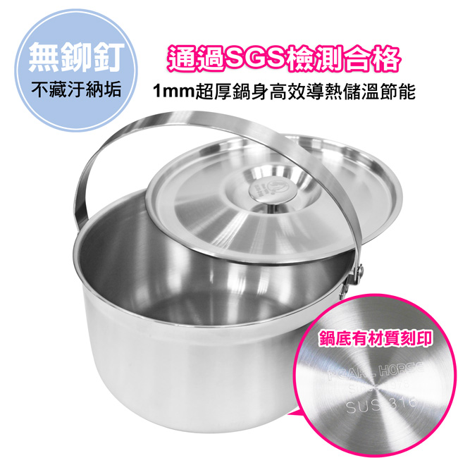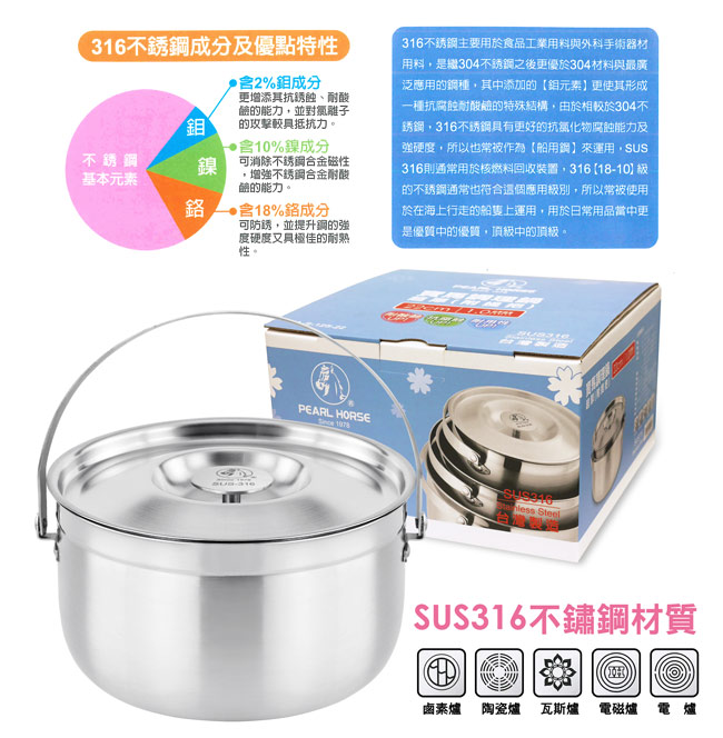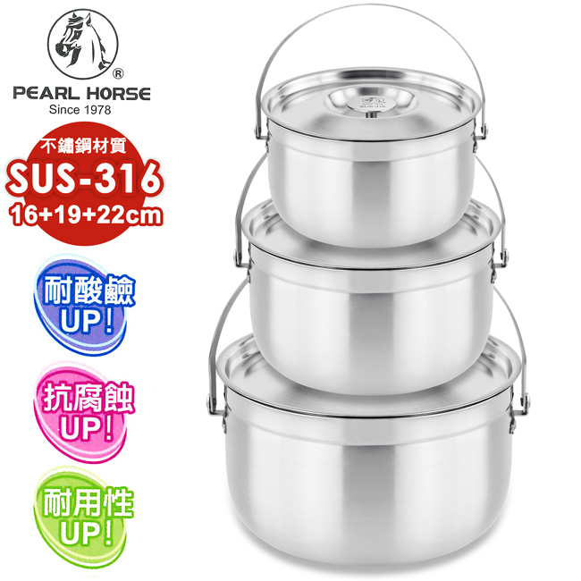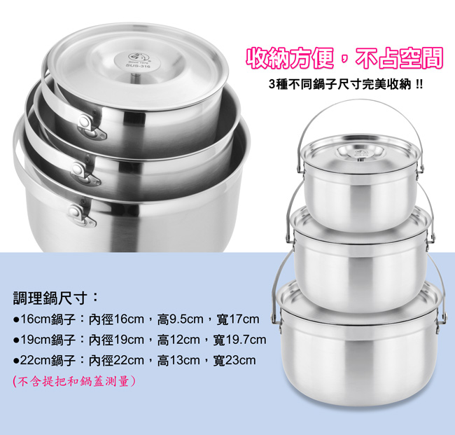 型號:TA-S-125-SET 規格:16+19+22cm(有提把) 材質:鍋身/鍋蓋是SUS316不鏽鋼、提把是SUS304不鏽鋼 產地:台灣 注意事項: ‧使用前請隨時檢查手把是否穩固,以避免發生危險 ‧新鍋使用前,請先用少量中性清潔劑搭配海綿清洗乾淨再使用 ‧請勿使用鋼刷或硬質菜瓜布等清洗,以免傷及鍋體表面材質 ‧直接加熱時,必須將提把直立向上,且勿讓火焰大於鍋體底部 ‧加熱時及鍋內熱滾時,請勿讓幼童靠近,以免發生危險 ‧拿取加熱後鍋子手把時,建議使用隔熱手套,以免燙傷 ‧本產品禁止空燒,嚴禁使用快速爐