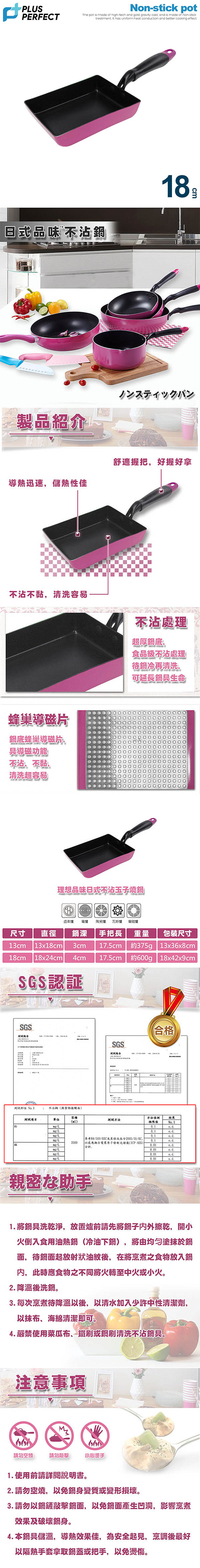 理想PERFECT 品味日式不沾玉子燒鍋 18cm無蓋 IKH_20218 台灣製 ■ 台灣製造 ■ 禁用鐵鏟、鐵刷、鋼絲球、菜瓜布 ■ 通過SGS無毒檢驗認證 ■ 超厚鍋底,食品級不沾處理 ■ 不沾處理,導熱均勻、儲熱性佳 ■ 耐炒、省時、省瓦斯,少油煙易清洗 ■ 適用電爐、瓦斯爐、鹵素爐、陶瓷爐、電磁爐 使用方法:使用前,以中性清潔劑和海綿清洗乾淨後即可使用。 保存方法:商品使用完敬請擦乾並保存於乾燥處。 注意事項: 1.請勿讓鍋具大火空燒過久,以免鍋身變質或變形、損壞。 2.請勿敲擊鍋面,以免鍋面產生凹洞,影響烹煮效果及破壞鍋身美觀。 3.爐火請勿過大以免食物溢出鍋緣,可常保鍋具乾淨美觀。 4.勿將食物放於鍋內過久,以致減損鍋具之壽命。 5.使用不沾鍋時不可開大火,只能維持中小火,只煎不炸,避免空燒。 6.清洗時請使用海綿或軟性菜瓜布,不可使用鐵刷,易造成鍋面刮傷。