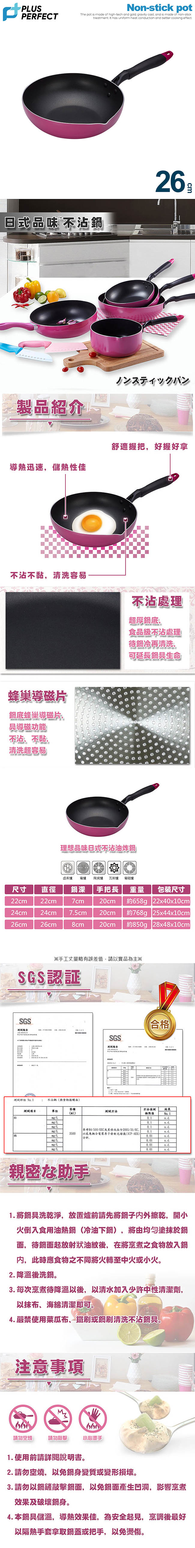 理想PERFECT 品味日式不沾油炸鍋 26cm無蓋 IKH_40226 台灣製 ■ 台灣製造 ■ 禁用鐵鏟、鐵刷、鋼絲球、菜瓜布 ■ 通過SGS無毒檢驗認證 ■ 超厚鍋底,食品級不沾處理 ■ 不沾處理,導熱均勻、儲熱性佳 ■ 耐炒、省時、省瓦斯,少油煙易清洗 ■ 適用電爐、瓦斯爐、鹵素爐、陶瓷爐、電磁爐 使用方法:使用前,以中性清潔劑和海綿清洗乾淨後即可使用。 保存方法:商品使用完敬請擦乾並保存於乾燥處。 注意事項: 1.請勿讓鍋具大火空燒過久,以免鍋身變質或變形、損壞。 2.請勿敲擊鍋面,以免鍋面產生凹洞,影響烹煮效果及破壞鍋身美觀。 3.爐火請勿過大以免食物溢出鍋緣,可常保鍋具乾淨美觀。 4.勿將食物放於鍋內過久,以致減損鍋具之壽命。 5.使用不沾鍋時不可開大火,只能維持中小火,避免空燒。 6.清洗時請使用海綿或軟性菜瓜布,不可使用鐵刷,易造成鍋面刮傷。