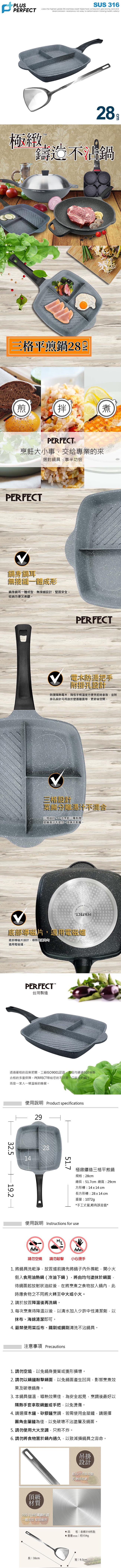 理想PERFECT 極緻鑄造三格平煎鍋 28cm無蓋(附316煎匙) SJ-2550028 台灣製 ■ 台灣製造 ■ 鍋身一體成型,好清洗,不容易藏污納垢 ■ 採高科技合金材質,具備高度不沾效果 ■ 分隔設計,可同時烹調不同食材 ■ 鍋柄可吊掛設計,方便收納 ■ 適用電爐、瓦斯爐、鹵素爐、陶瓷爐、電磁爐 ■ 316不鏽鋼煎匙,貼心吊掛設計 使用方法:使用前,以中性清潔劑和海綿清洗乾淨後即可使用。 保存方法:商品使用完敬請擦乾並保存於乾燥處。 注意事項: 1.請勿讓鍋具大火空燒過久,以免鍋身變質或變形、損壞。 2.請勿敲擊鍋面,以免鍋面產生凹洞,影響烹煮效果及破壞鍋身美觀。 3.爐火請勿過大以免食物溢出鍋緣,可常保鍋具乾淨美觀。 4.勿將食物放於鍋內過久,以致減損鍋具之壽命。 5.使用不沾鍋時不可開大火,只能維持中小火,只煎不炸,避免空燒。 6.清洗時請使用海綿或軟性菜瓜布,不可使用鐵刷,易造成鍋面刮傷。