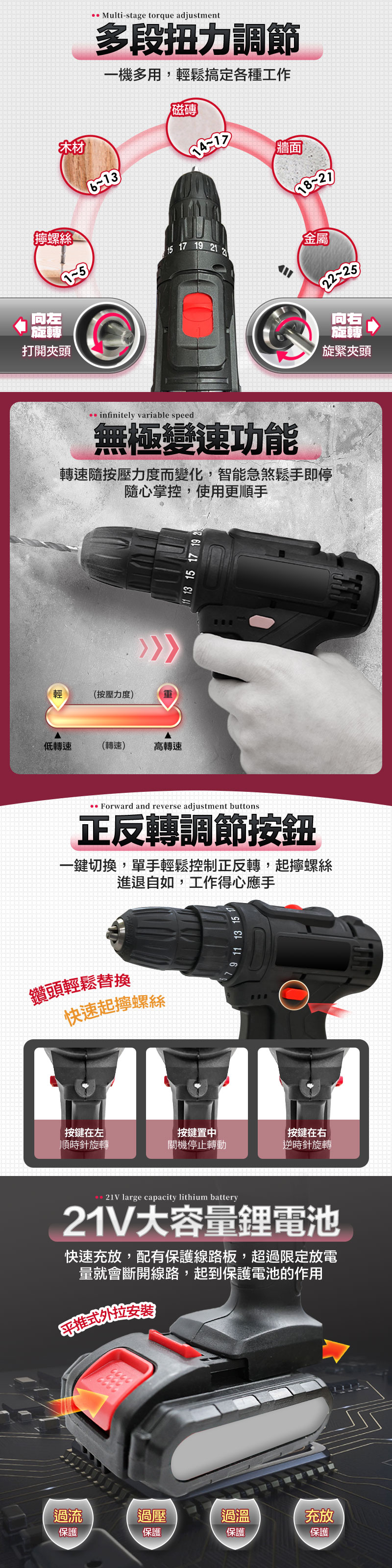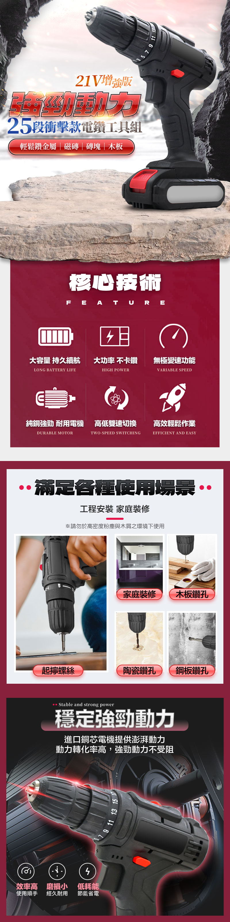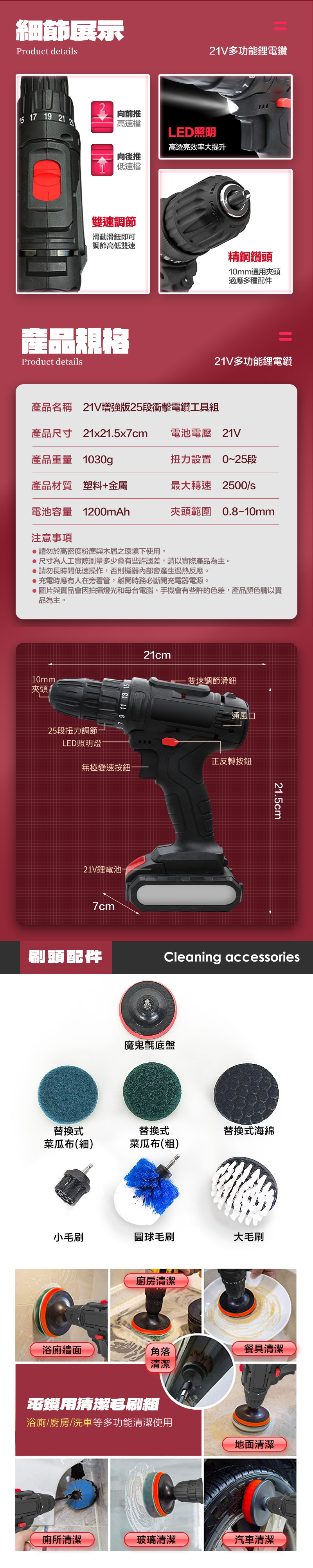 名稱:21V增強版25段衝擊電鑽工具組 尺寸:21x21.5x7cm 重量:1030g 顏色:黑色 材質:塑料+金屬 電池容量:1200mAh 電壓:21V 扭力:25段 輸出軸:10mm 扭力範圍:0-25N/M 最大轉速:2500/s 變速功能:兩段雙速可切換 按鍵功能:無級調速快慢轉+正反轉 包裝尺寸:28.5x24.5x8cm 包裝重量:1970g 商品內容:主機x1/變壓器x1/螺母套筒x9/兩用批頭x2/麻花鑽頭x4/ 磁磚鑽頭x1/批頭連接管x1/轉接批頭x10/萬向軟管x1/說明書x1/保固卡x1 商品保固:主機非人為因素保固三個月,憑發票保固 產地:中國 以上規格有任何說明錯誤依原廠公告為主 注意事項: 1.建議操作時請自行配戴耳,護目鏡,口罩。 2.請勿長時間低速運作,否則機器內部會產生過熱反應。 3.僅機身生活防水,電池及開關處請勿接觸水源。 4.長時間不使用時,請將電池與主機妥善收納。 5.充電時應有人在旁看管,離開時請務必斷開充電器電源。 6.此為修繕強力工具,勿讓孩童單獨使用以免發生危險。 7.本產品僅提供正當用途行為使用,若有不當使用歸屬於個人行為,需自行承擔法律責任。