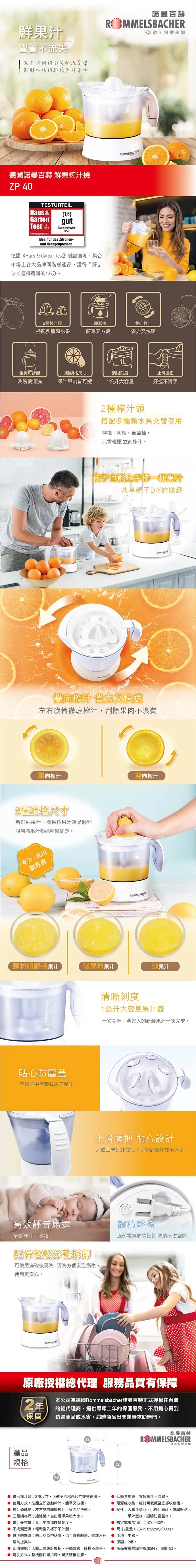 錐形榨汁頭:2種尺寸,可依不同水果尺寸交替使用 使用方式:按壓立即啟動榨汁,簡單又方便 榨汁頭轉動:左右雙向轉動榨汁,省力又快速 三種網格尺寸過濾盤:自由選擇果粒大小 果汁壺容量:1L,並附清晰精刻度 不滴漏壺嘴:輕鬆倒入杯子不外灑 透明防塵蓋:防止空氣中落塵,也可直接將果汁壺放入冰箱防止異味 止滑握把:人體工學設計握把,手感舒適,好握不滑手 清洗方式:整機配件可拆卸,可洗碗機洗滌 低噪音馬達:安靜榨汁不吵雜 電源線收納:線材可收藏至底部收納槽 配件:大榨汁頭x1、小榨汁頭x1、濾網盤x2、果汁壺x1、透明防塵蓋x1 額定電壓/功率:110V/40W 尺寸/重量:23x15.8x22cm/900g 產地:中國 保固:2年 商品檢驗標識字號(BSMI):R36153