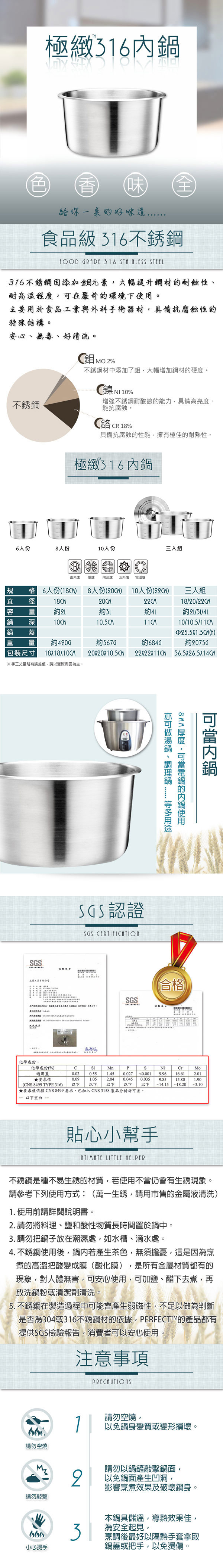 規格/型號/國際條碼: 六人份(約2L)【KH_33018_1】4716369319504 八人份(約3L)【KH_33020_1】4716369319511 十人份(約4L)【KH_33022_1】4716369319528 三入組【KH_40501】4716369319573 通用蓋【IKH_99901】4716369319801 材質:316不銹鋼 產地:台灣 使用方法: 1.使用前以水和少許麵粉(稀糊狀)與清潔劑清洗,清洗乾淨後即可使用。 2.如過度刷洗,造成表面殘餘黑色不銹鋼成分,請以軟質布面或海綿再清洗一次即可。 3.烹調後如出現白色斑點或是彩虹紋,此為澱粉和水中礦物質所形成之正常現象,可用不銹鋼專用清潔劑浸泡後洗淨。 4.鍋身如有變黃,可能是因為火太大造成油、調味料粘附鍋身,可用不銹鋼專用清潔劑浸泡後洗淨。 保存方法:商品使用完敬請擦乾並保存於通風乾燥處,避免與強酸、鹼性溶劑共同存放,以免造成商品銹蝕。 注意事項: 1.請勿讓鍋具大火空燒過久,以免鍋身變質或變形、損壞。 2.請勿敲擊鍋面,以免鍋面產生凹洞,影響烹煮效果及破壞鍋身美觀。 3.烹調中或高溫尚未清洗時,避免碰觸鍋身,以免燙傷。 4.使用瓦斯爐具時,爐火請勿過大以免食物溢出鍋緣,發生瓦斯外溢危險,亦可常保鍋具乾淨美觀。