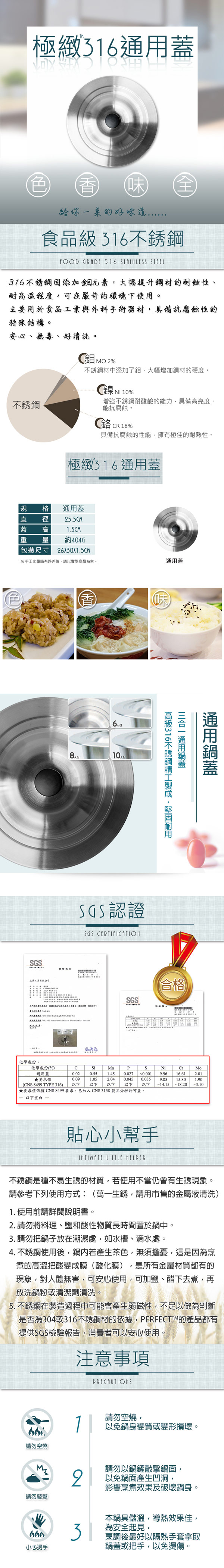 規格/型號/國際條碼: 通用蓋【IKH_99901】4716369319801 材質:316不銹鋼 產地:台灣 使用方法: 1.使用前以水和少許麵粉(稀糊狀)與清潔劑清洗,清洗乾淨後即可使用。 2.如過度刷洗,造成表面殘餘黑色不銹鋼成分,請以軟質布面或海綿再清洗一次即可。 3.烹調後如出現白色斑點或是彩虹紋,此為澱粉和水中礦物質所形成之正常現象,可用不銹鋼專用清潔劑浸泡後洗淨。 4.鍋身如有變黃,可能是因為火太大造成油、調味料粘附鍋身,可用不銹鋼專用清潔劑浸泡後洗淨。 保存方法:商品使用完敬請擦乾並保存於通風乾燥處,避免與強酸、鹼性溶劑共同存放,以免造成商品銹蝕。 注意事項: 1.請勿讓鍋具大火空燒過久,以免鍋身變質或變形、損壞。 2.請勿敲擊鍋面,以免鍋面產生凹洞,影響烹煮效果及破壞鍋身美觀。 3.烹調中或高溫尚未清洗時,避免碰觸鍋身,以免燙傷。 4.使用瓦斯爐具時,爐火請勿過大以免食物溢出鍋緣,發生瓦斯外溢危險,亦可常保鍋具乾淨美觀。