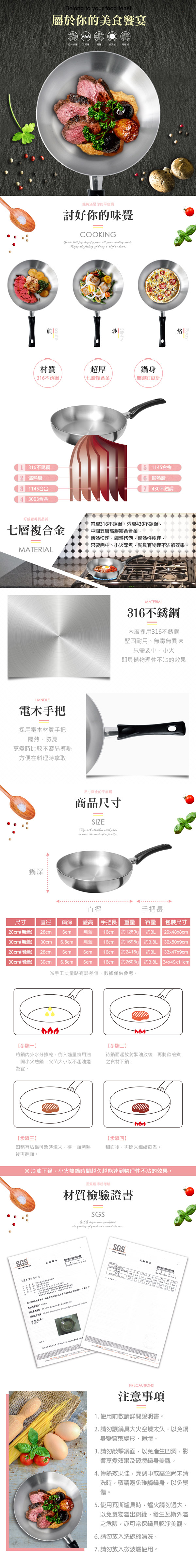 規格/型號/國際條碼: 28cm(無蓋)【KH_21328_1】4716369320821 30cm(無蓋)【KH_21330_1】4716369320838 材質:鍋身-內層316不銹鋼、外層430不銹鋼 把手-電木 28cm(附蓋)【KH_21328】4716369320791 30cm(附蓋)【KH_21330】4716369320784 材質:鍋身-內層316不銹鋼、外層430不銹鋼 鍋蓋-強化玻璃、電木珠頭 把手-電木 產地:台灣 使用方法: 1.使用前以水和少許麵粉(稀糊狀)與清潔劑清洗,清洗乾淨後即可使用。 2.如過度刷洗,造成表面殘餘黑色不銹鋼成分,請以軟質布面或海綿再清洗一次即可。 3.烹調後如出現白色斑點或是彩虹紋,此為澱粉和水中礦物質所形成之正常現象,可用不銹鋼專用清潔劑浸泡後洗淨。 4.鍋身如有變黃,可能是因為火太大造成油、調味料粘附鍋身,可用不銹鋼專用清潔劑浸泡後洗淨。 保存方法:商品使用完敬請擦乾並保存於乾燥處,避免與強酸、鹼性溶劑共同存放,以免造成商品銹蝕。 注意事項: 1.請勿讓鍋具大火空燒過久,以免鍋身變質或變形、損壞。 2.請勿敲擊鍋面,以免鍋面產生凹洞,影響烹煮效果及破壞鍋身美觀。 3.烹調中或高溫尚未清洗時,避免碰觸鍋身,以免燙傷。 4.使用瓦斯爐具時,爐火請勿過大以免食物溢出鍋緣,發生瓦斯外溢危險,亦可常保鍋具乾淨美觀。