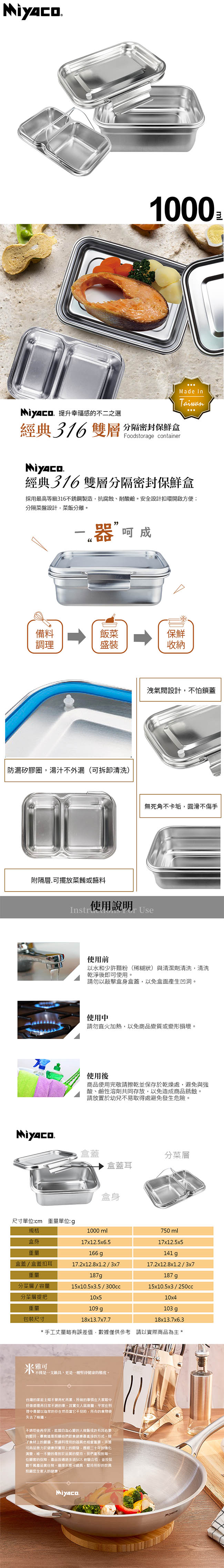 米雅可 經典316雙層分隔密封保鮮盒17cm(1000ml) MY-G10T172 台灣製 ■ 台灣製造 ■ 高等級316不鏽鋼,抗腐蝕、耐酸鹼 ■ 安全設計扣環開啟方便 ■ 分隔菜盤設計,菜飯分離 ■ 分隔菜盤,可擺放菜餚或醬料 ■ 防漏矽膠圈,湯汁不外漏(可拆卸清洗) ■ 洩氣閥設計,不派鎖蓋 ■ 無死角不卡垢,圓滑不傷手