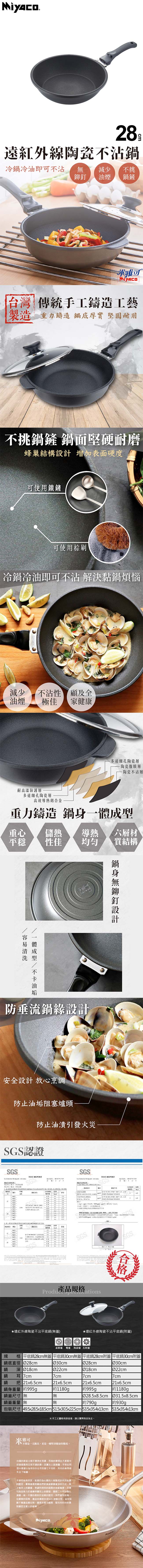 米雅可 遠紅外線陶瓷不沾平底鍋28cm(無蓋) MY-B01F280 台灣製 ■ 台灣製造 ■ 本系列產品採用陶瓷腹膜科技不沾處理技術,擁有絕佳的耐用度及不沾的效果 ■ 鍋身無鉚釘一體成型設計;特殊蜂巢結構,增加表面硬度,可使用金屬鏟 ■ 不挑鍋鏟,可使用棕刷清洗 ■ 鍋緣防垂流設計,防止油漬沾汙鍋底;可拆式手把,方便清潔及收納 ■ 台灣傳統手工鑄造工藝,加厚鍋身,堅固經久耐用,儲熱性極佳 ■ SGS認證 ■ 適用鹵素爐、電爐、陶瓷爐、瓦斯爐等爐具
