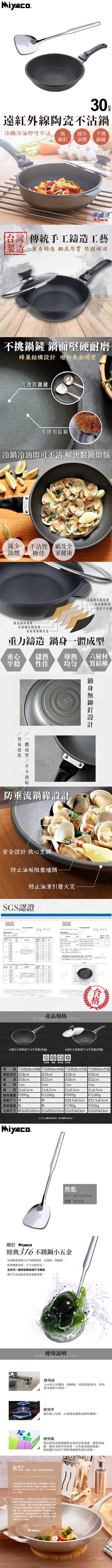 米雅可 遠紅外線陶瓷不沾平底鍋30cm(無蓋)MY-B01F300贈316不鏽鋼煎匙MY-J100010 ■ 台灣製造 ■ 本系列產品採用陶瓷腹膜科技不沾處理技術,擁有絕佳的耐用度及不沾的效果 ■ 鍋身無鉚釘一體成型設計;特殊蜂巢結構,增加表面硬度,可使用金屬鏟 ■ 不挑鍋鏟,可使用棕刷清洗 ■ 鍋緣防垂流設計,防止油漬沾汙鍋底;可拆式手把,方便清潔及收納 ■ 台灣傳統手工鑄造工藝,加厚鍋身,堅固經久耐用,儲熱性極佳 ■ SGS認證 ■ 適用鹵素爐、電爐、陶瓷爐、瓦斯爐等爐具 贈 米雅可 經典316不鏽鋼煎匙 MY-J100010 ■ 頂級316不鏽鋼材質製造,因添加鉬元素,使其更耐酸鹼及腐蝕 ■ 一體成形,方便清洗,不易藏汙納垢 ■ 精緻鋼印,無捲邊設計,特級厚度,堅固耐用 ■ 手柄處採特殊斷熱處理設計,不易燙手