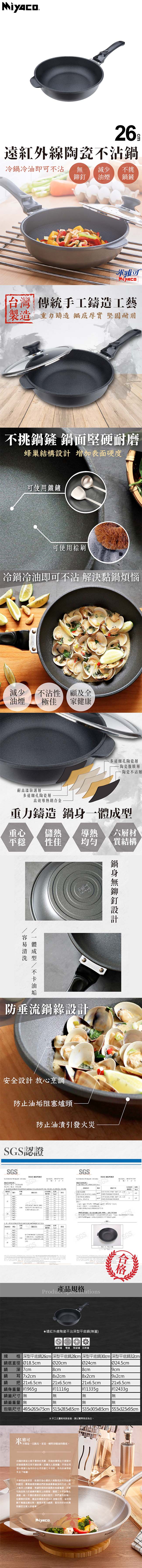 米雅可 遠紅外線陶瓷不沾深型平底鍋26cm(無蓋) MY-B01P260 台灣製 ■ 台灣製造 ■ 本系列產品採用陶瓷腹膜科技不沾處理技術,擁有絕佳的耐用度及不沾的效果 ■ 鍋身無鉚釘一體成型設計;特殊蜂巢結構,增加表面硬度,可使用金屬鏟 ■ 不挑鍋鏟,可使用棕刷清洗 ■ 鍋緣防垂流設計,防止油漬沾汙鍋底;可拆式手把,方便清潔及收納 ■ 台灣傳統手工鑄造工藝,加厚鍋身,堅固經久耐用,儲熱性極佳 ■ SGS認證 ■ 適用鹵素爐、電爐、陶瓷爐、瓦斯爐等爐具