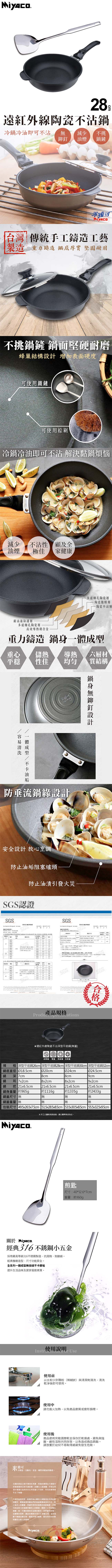 米雅可 遠紅外線陶瓷不沾深型平底鍋28cm(無蓋)MY-B01P280贈316不鏽鋼煎匙MY-J100010 ■ 台灣製造 ■ 本系列產品採用陶瓷腹膜科技不沾處理技術,擁有絕佳的耐用度及不沾的效果 ■ 鍋身無鉚釘一體成型設計;特殊蜂巢結構,增加表面硬度,可使用金屬鏟 ■ 不挑鍋鏟,可使用棕刷清洗 ■ 鍋緣防垂流設計,防止油漬沾汙鍋底;可拆式手把,方便清潔及收納 ■ 台灣傳統手工鑄造工藝,加厚鍋身,堅固經久耐用,儲熱性極佳 ■ SGS認證 ■ 適用鹵素爐、電爐、陶瓷爐、瓦斯爐等爐具 贈 米雅可 經典316不鏽鋼煎匙 MY-J100010 ■ 頂級316不鏽鋼材質製造,因添加鉬元素,使其更耐酸鹼及腐蝕 ■ 一體成形,方便清洗,不易藏汙納垢 ■ 精緻鋼印,無捲邊設計,特級厚度,堅固耐用 ■ 手柄處採特殊斷熱處理設計,不易燙手