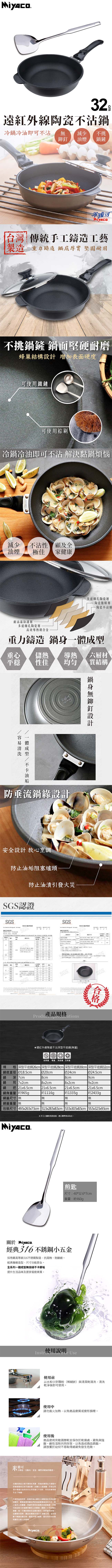 米雅可 遠紅外線陶瓷不沾深型平底鍋32cm(無蓋)MY-B01P320贈316不鏽鋼煎匙MY-J100010 ■ 台灣製造 ■ 本系列產品採用陶瓷腹膜科技不沾處理技術,擁有絕佳的耐用度及不沾的效果 ■ 鍋身無鉚釘一體成型設計;特殊蜂巢結構,增加表面硬度,可使用金屬鏟 ■ 不挑鍋鏟,可使用棕刷清洗 ■ 鍋緣防垂流設計,防止油漬沾汙鍋底;可拆式手把,方便清潔及收納 ■ 台灣傳統手工鑄造工藝,加厚鍋身,堅固經久耐用,儲熱性極佳 ■ SGS認證 ■ 適用鹵素爐、電爐、陶瓷爐、瓦斯爐等爐具 贈 米雅可 經典316不鏽鋼煎匙 MY-J100010 ■ 頂級316不鏽鋼材質製造,因添加鉬元素,使其更耐酸鹼及腐蝕 ■ 一體成形,方便清洗,不易藏汙納垢 ■ 精緻鋼印,無捲邊設計,特級厚度,堅固耐用 ■ 手柄處採特殊斷熱處理設計,不易燙手